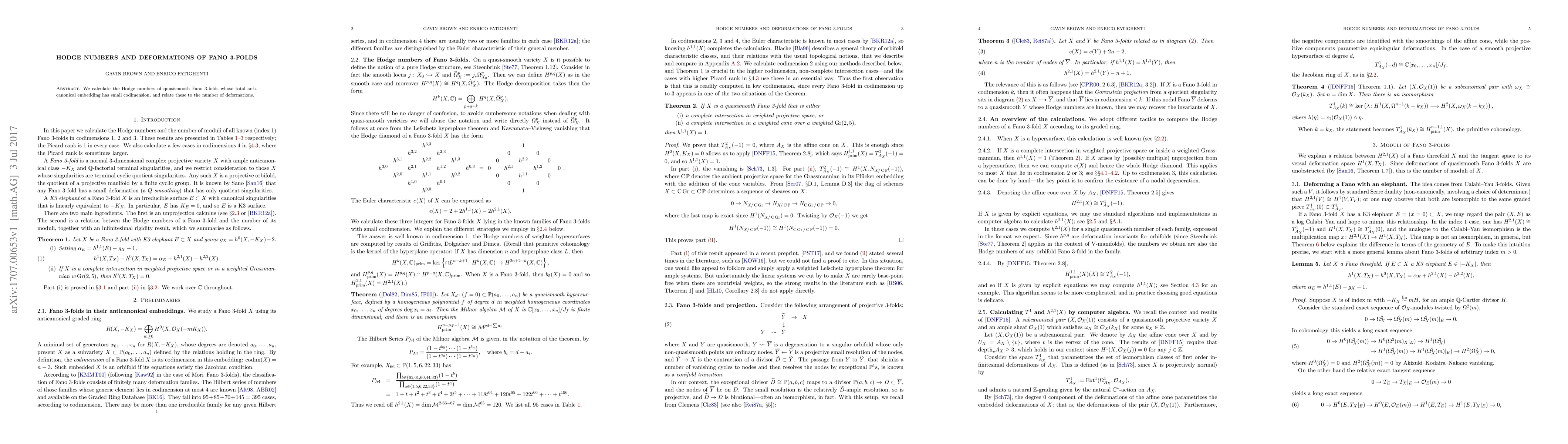 Summary: This paper computes the Hodge numbers for quasismooth Fano 3-folds with minimal codimension in their anti-canonical embeddings and links these Hodge numbers to the count of their deformations.