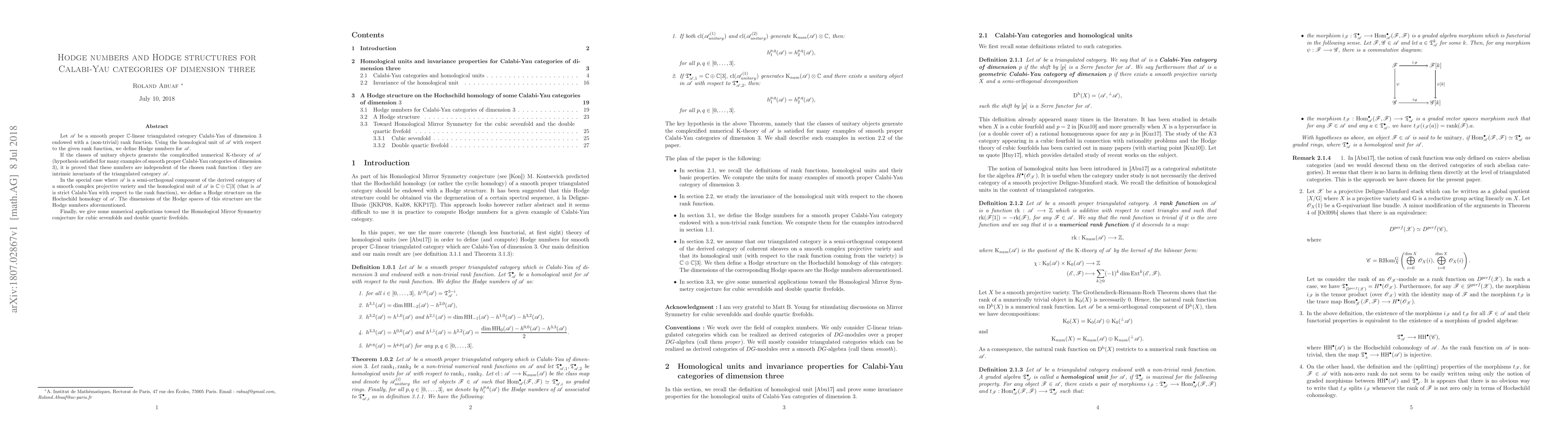 This paper defines Hodge numbers for smooth proper Calabi-Yau categories of dimension three, proving their independence from the rank function under certain conditions. It also introduces Hodge structures on the Hochschild homology for strict Calabi-Yau categories, providing numerical applications to support the Homological Mirror Symmetry conjecture.