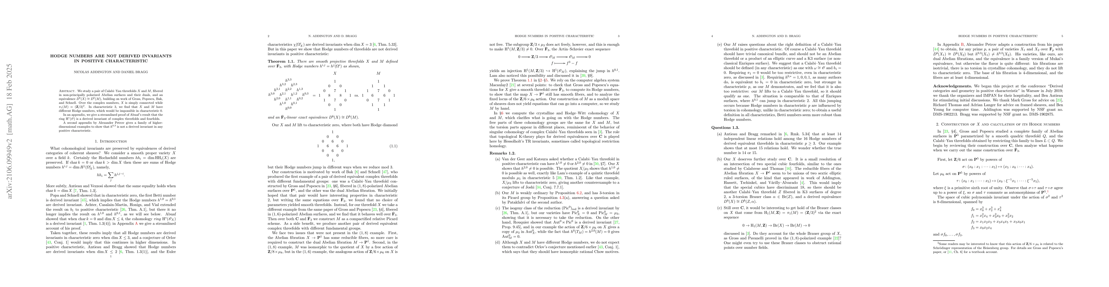 This paper demonstrates that Hodge numbers differ between Calabi-Yau threefolds X and M in positive characteristic, despite their equivalence in derived categories. It also provides a streamlined proof of Abuaf's result on derived invariants and shows through higher-dimensional examples that h^{0,3} is not a derived invariant in any positive characteristic.