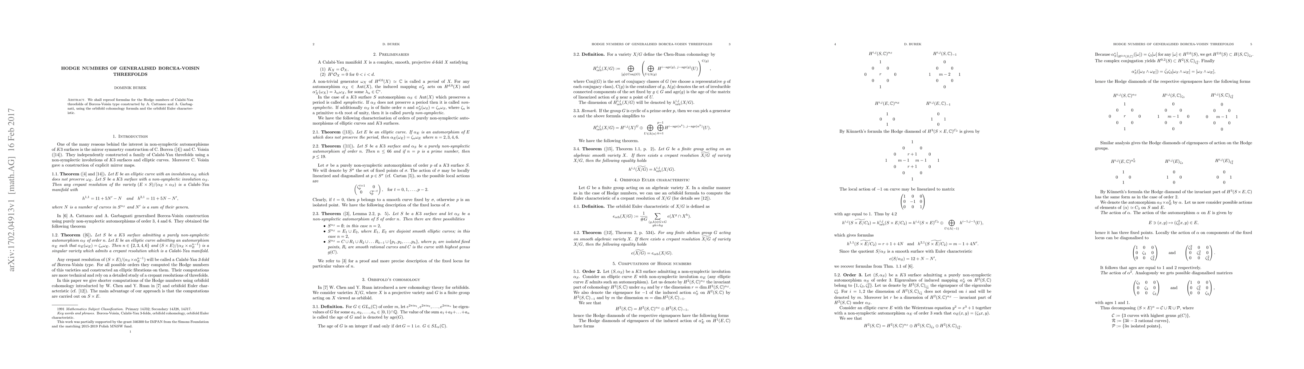 This paper reproves formulas for the Hodge numbers of Calabi-Yau threefolds of Borcea-Voisin type using orbifold cohomology and the orbifold Euler characteristic, verifying results previously established by Cattaneo and Garbagnati.