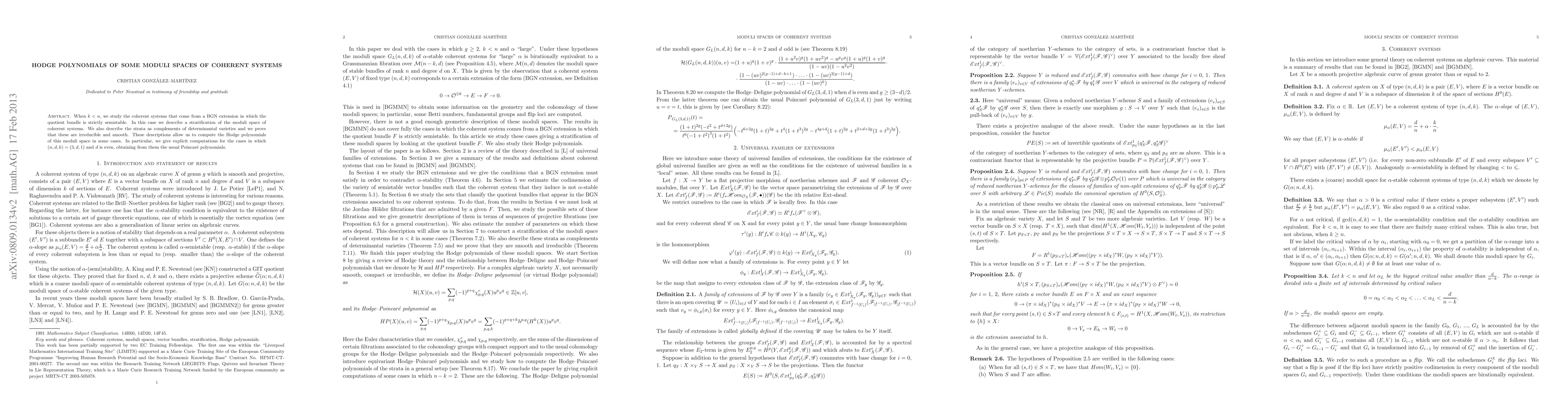 This paper studies moduli spaces of coherent systems derived from BGN extensions with strictly semistable quotient bundles, providing a stratification description. It proves the strata's irreducibility and smoothness, enabling the computation of Hodge polynomials, with explicit results for cases where $(n,d,k)=(3,d,1)$ and $d$ is even.