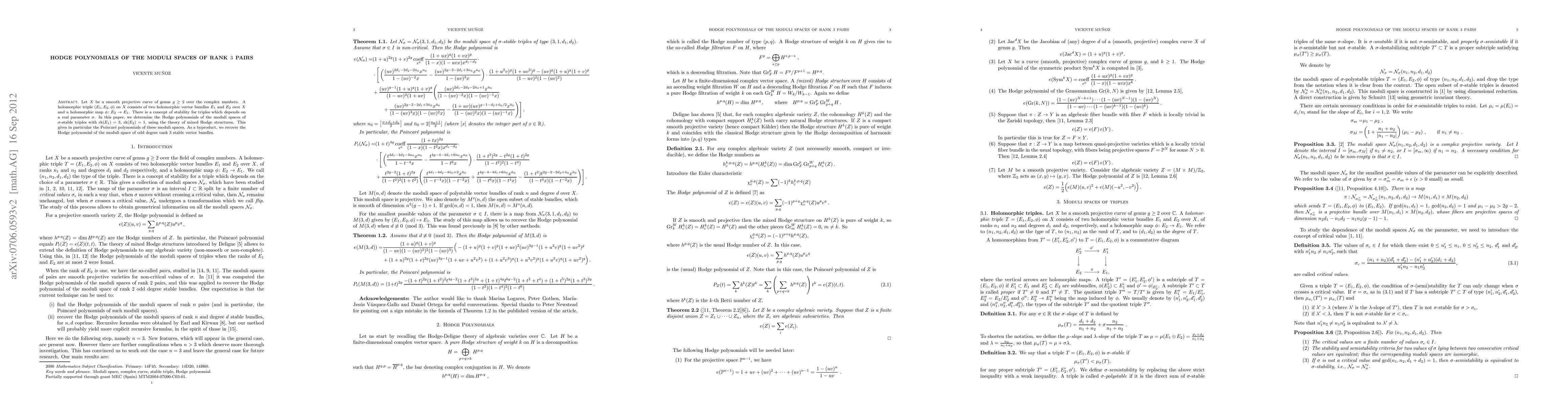 This paper computes the Hodge polynomials of moduli spaces of rank 3 pairs $(E_1, E_2, \phi)$ on a smooth projective curve $X$, where $E_1$ has rank 3 and $E_2$ rank 1, using mixed Hodge structure theory. It also recovers the Hodge polynomial for moduli spaces of odd degree rank 3 stable vector bundles as a byproduct.