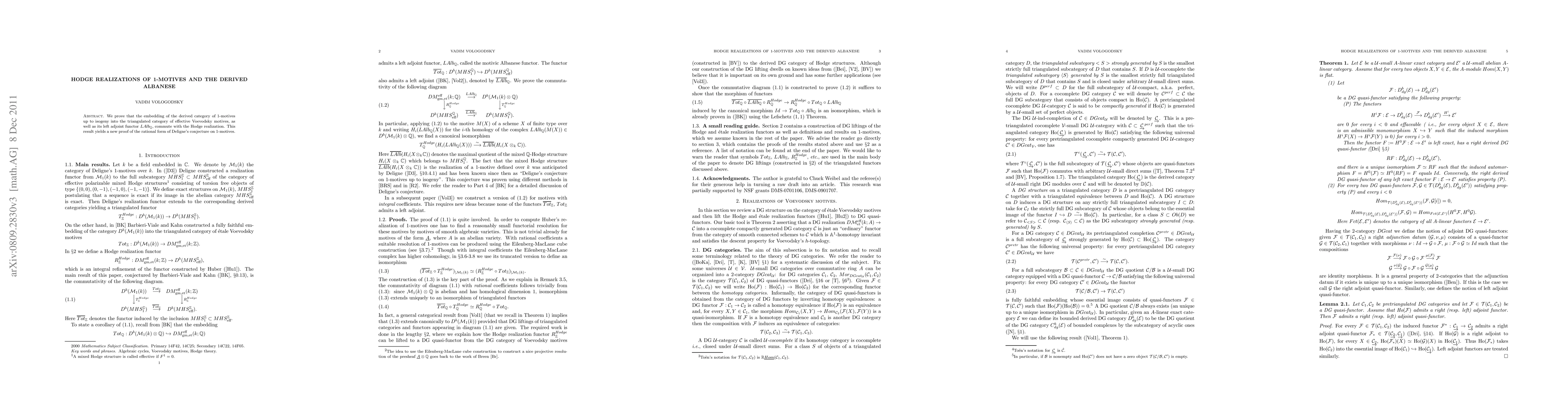 Summary: The paper establishes that the derived category of 1-motives embeds into the category of effective Voevodsky motives and its left adjoint functor aligns with Hodge realizations, ensuring compatibility between these structures.
