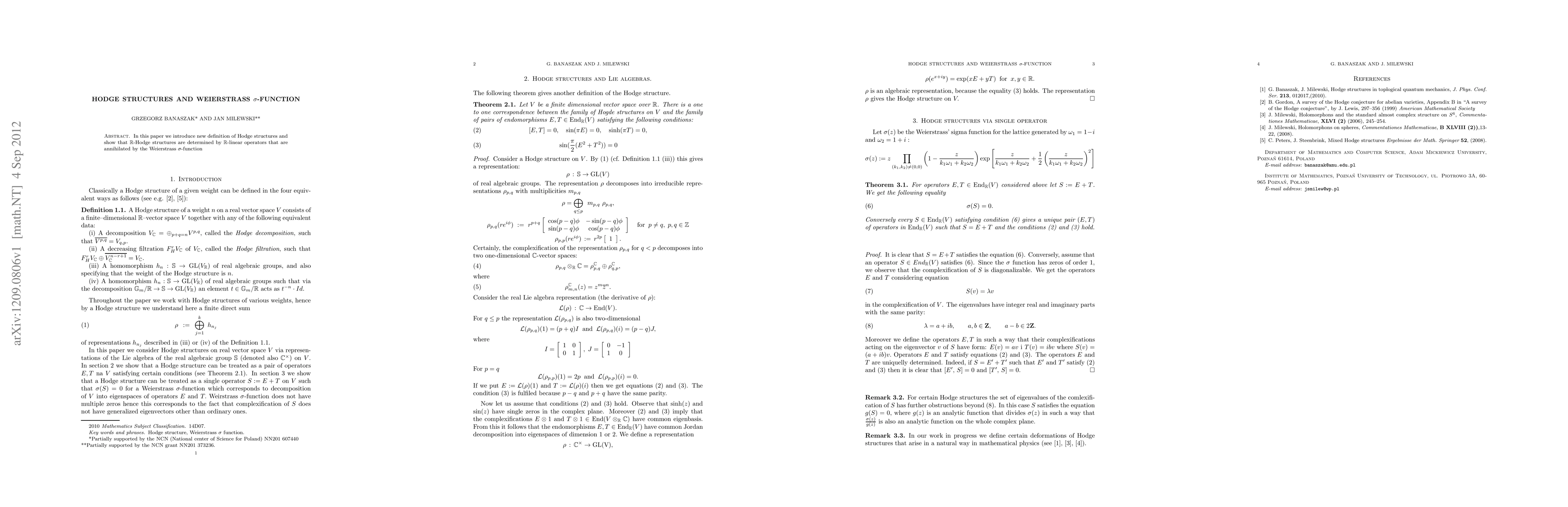 In this paper we introduce new definition of Hodge structures and show that $\R$-Hodge structures are determined by $\R$-linear operators that are annihilated by the Weierstrass $\sigma$-function