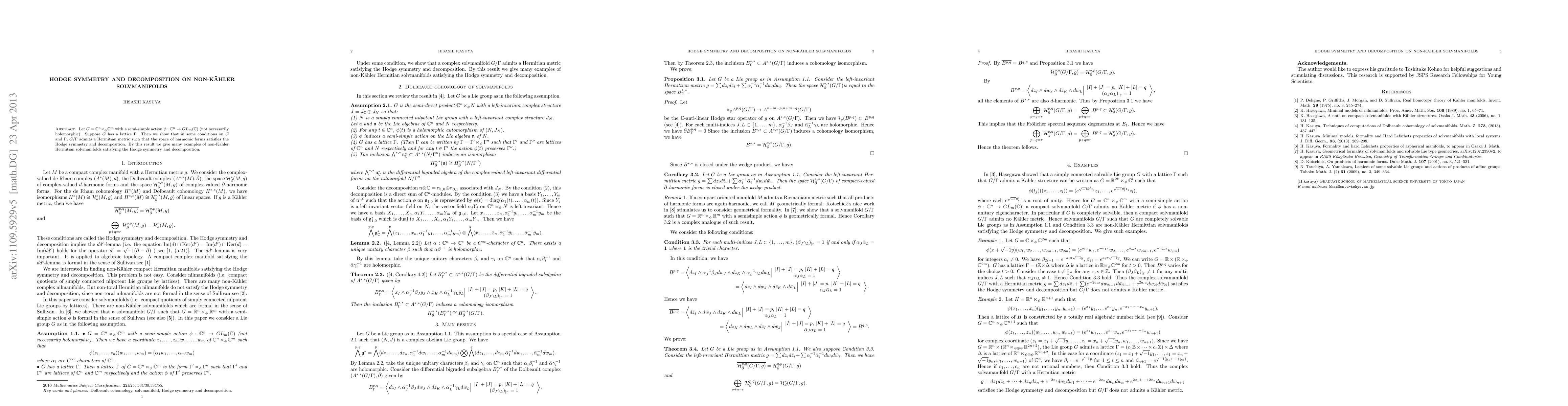 The paper demonstrates that under certain conditions on $G$ and $\Gamma$, the solvmanifold $G/\Gamma$ can be endowed with a Hermitian metric where the space of harmonic forms exhibits Hodge symmetry and decomposition, illustrating this with examples of non-Kähler Hermitian solvmanifolds.