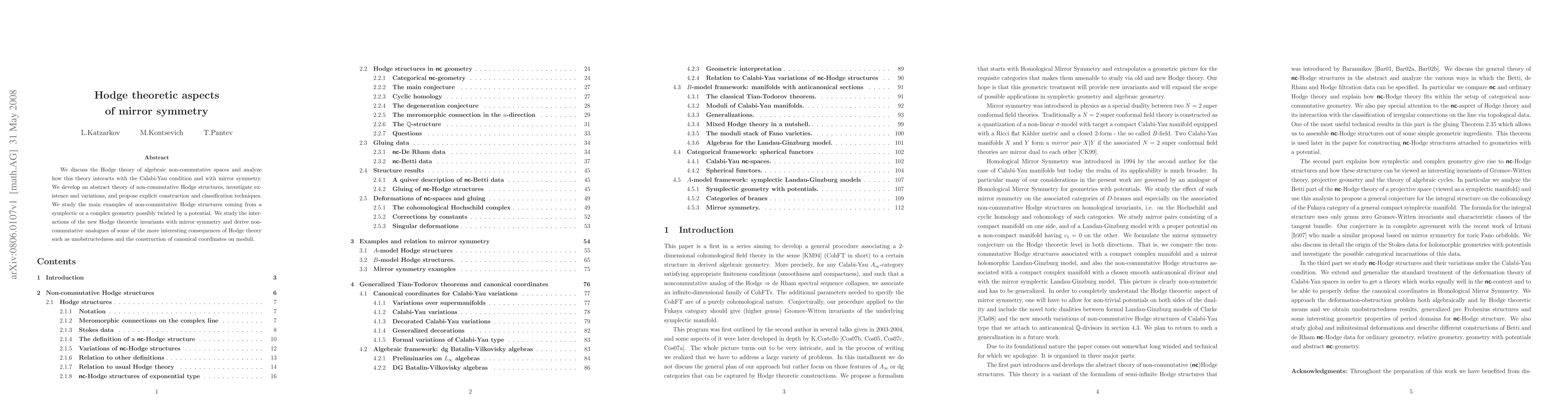 We discuss the Hodge theory of algebraic non-commutative spaces and analyze how this theory interacts with the Calabi-Yau condition and with mirror symmetry. We develop an abstract theory of non-commutative Hodge structures, investigate existence and variations, and propose explicit construction and classification techniques. We study the main examples of non-commutative Hodge structures coming from a symplectic or a complex geometry possibly twisted by a potential. We study the interactions of the new Hodge theoretic invariants with mirror symmetry and derive non-commutative analogues of some of the more interesting consequences of Hodge theory such as unobstructedness and the construction of canonical coordinates on moduli.