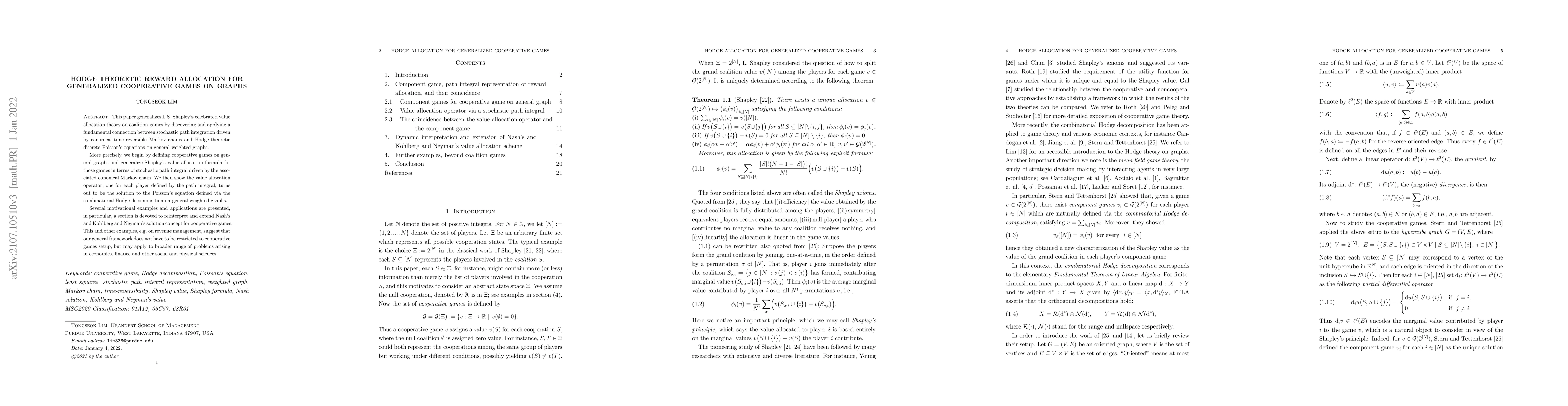 This paper generalizes L.S. Shapley's celebrated value allocation theory on coalition games by discovering and applying a fundamental connection between stochastic path integration driven by canonical time-reversible Markov chains and Hodge-theoretic discrete Poisson's equations on general weighted graphs. More precisely, we begin by defining cooperative games on general graphs and generalize Shapley's value allocation formula for those games in terms of stochastic path integral driven by the associated canonical Markov chain. We then show the value allocation operator, one for each player defined by the path integral, turns out to be the solution to the Poisson's equation defined via the combinatorial Hodge decomposition on general weighted graphs. Several motivational examples and applications are presented, in particular, a section is devoted to reinterpret and extend Nash's and Kohlberg and Neyman's solution concept for cooperative games. This and other examples, e.g. on revenue management, suggest that our general framework does not have to be restricted to cooperative games setup, but may apply to broader range of problems arising in economics, finance and other social and physical sciences.