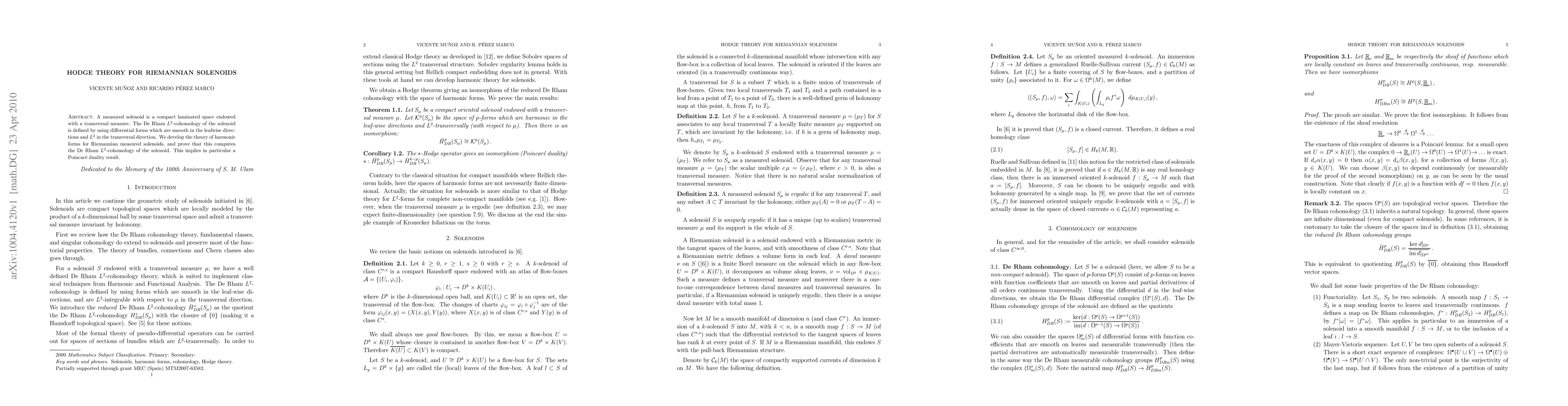 The paper introduces a rigorous Hodge theory for Riemannian measured solenoids, defining harmonic forms and proving their relation to the De Rham L2-cohomology, including a Poincaré duality result.