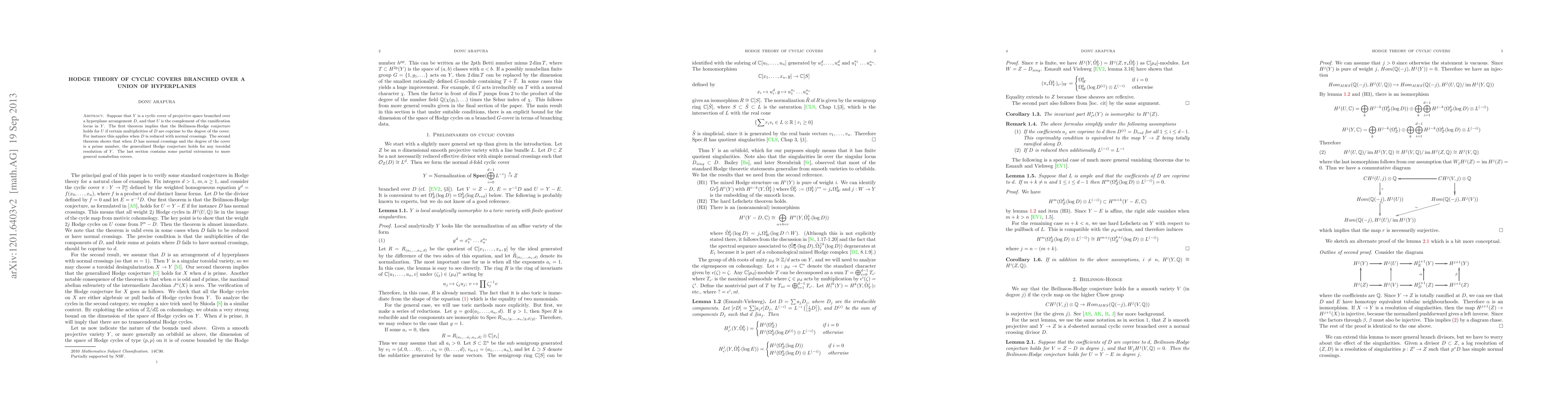 Suppose that Y is a cyclic cover of projective space branched over a hyperplane arrangement D, and that U is the complement of the ramification locus in Y. The first theorem implies that the Beilinson-Hodge conjecture holds for U if certain multiplicities of D are coprime to the degree of the cover. For instance this applies when D is reduced with normal crossings. The second theorem shows that when D has normal crossings and the degree of the cover is a prime number, the generalized Hodge conjecture holds for any toroidal resolution of Y. The last section contains some partial extensions to more general nonabelian covers.