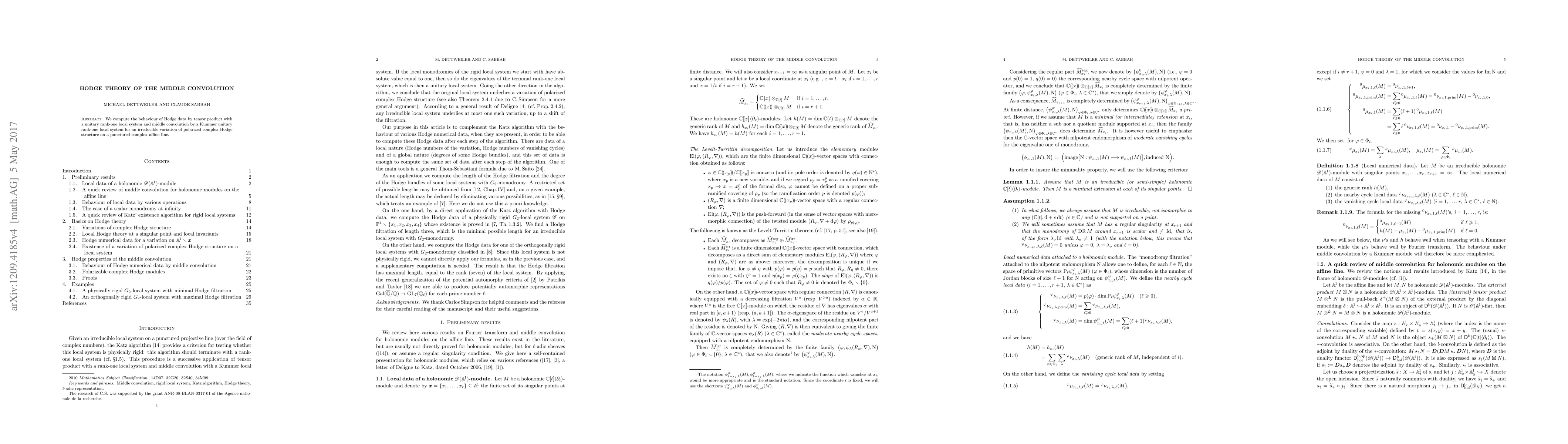 We compute the behaviour of Hodge data by tensor product with a unitary rank-one local system and middle convolution by a Kummer unitary rank-one local system for an irreducible variation of polarized complex Hodge structure on a punctured complex affine line. We give applications of these formulas to local systems with G_2-monodromy.