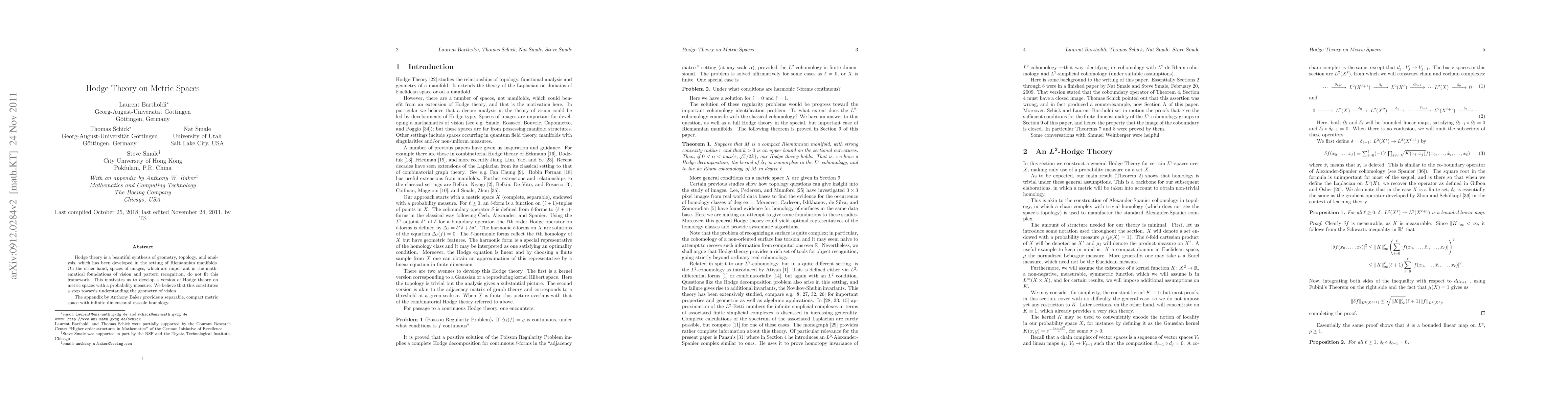 This paper develops a version of Hodge theory on metric spaces equipped with a probability measure, aiming to extend its applications to the geometry of vision and pattern recognition. An appendix by Anthony Baker presents a separable, compact metric space with infinite-dimensional α-scale homology.