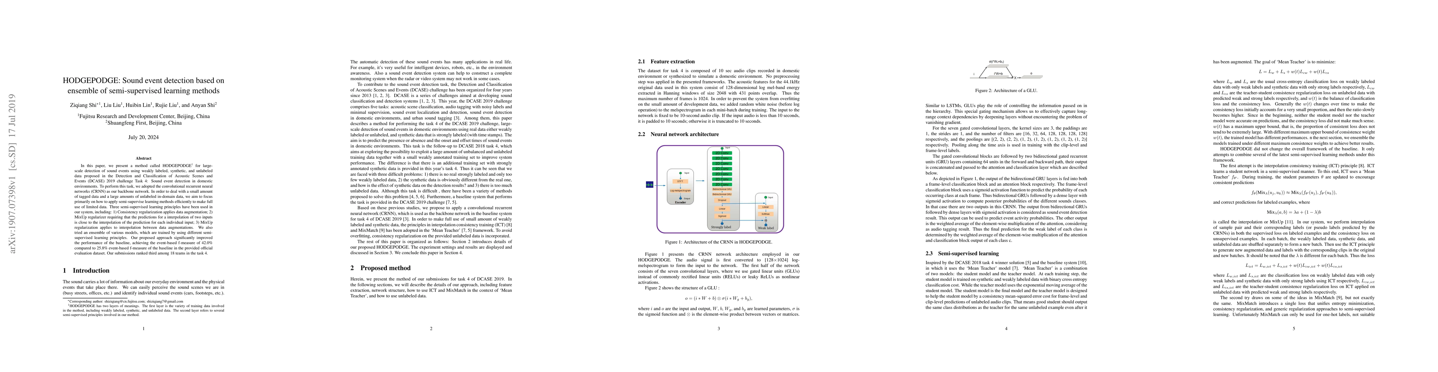 In this paper, we present a method called HODGEPODGE\footnotemark[1] for large-scale detection of sound events using weakly labeled, synthetic, and unlabeled data proposed in the Detection and Classification of Acoustic Scenes and Events (DCASE) 2019 challenge Task 4: Sound event detection in domestic environments. To perform this task, we adopted the convolutional recurrent neural networks (CRNN) as our backbone network. In order to deal with a small amount of tagged data and a large amounts of unlabeled in-domain data, we aim to focus primarily on how to apply semi-supervise learning methods efficiently to make full use of limited data. Three semi-supervised learning principles have been used in our system, including: 1) Consistency regularization applies data augmentation; 2) MixUp regularizer requiring that the predictions for a interpolation of two inputs is close to the interpolation of the prediction for each individual input; 3) MixUp regularization applies to interpolation between data augmentations. We also tried an ensemble of various models, which are trained by using different semi-supervised learning principles. Our proposed approach significantly improved the performance of the baseline, achieving the event-based f-measure of 42.0\% compared to 25.8\% event-based f-measure of the baseline in the provided official evaluation dataset. Our submissions ranked third among 18 teams in the task 4.