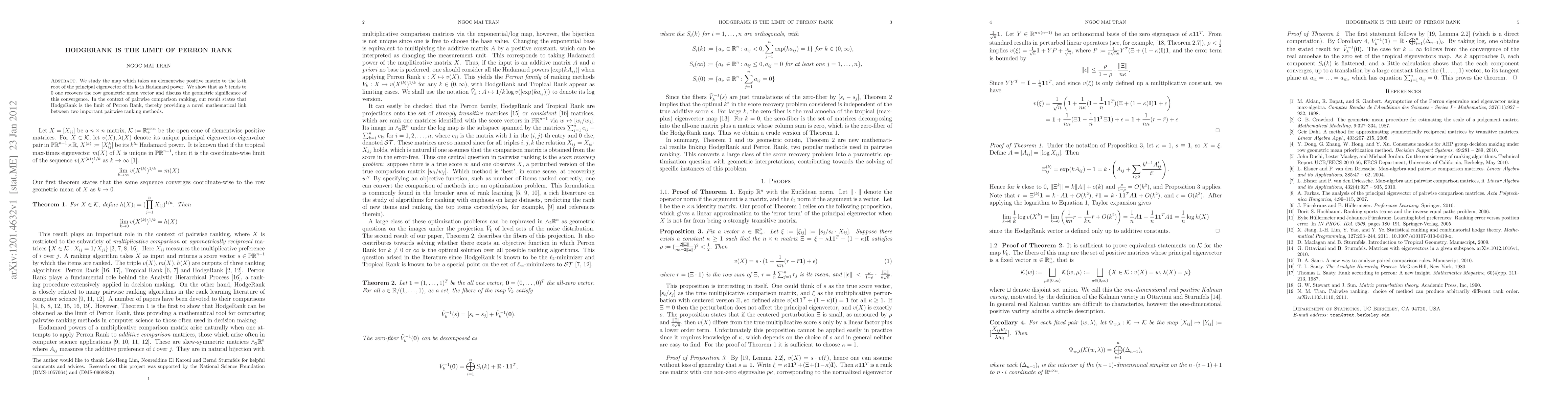 We study the map which takes an elementwise positive matrix to the k-th root of the principal eigenvector of its k-th Hadamard power. We show that as $k$ tends to 0 one recovers the row geometric mean vector and discuss the geometric significance of this convergence. In the context of pairwise comparison ranking, our result states that HodgeRank is the limit of Perron Rank, thereby providing a novel mathematical link between two important pairwise ranking methods.