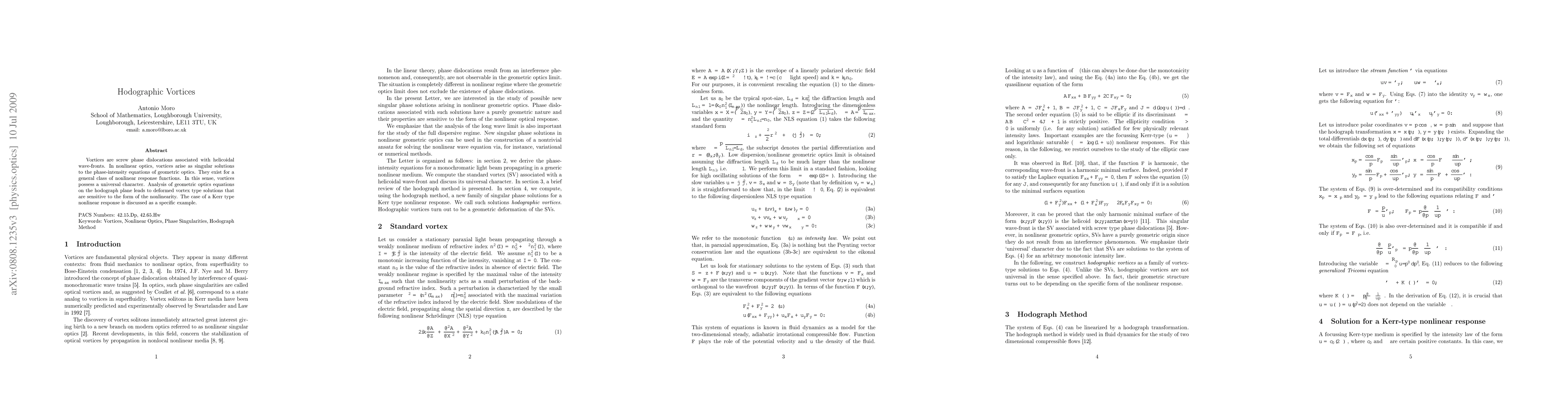 Vortices are screw phase dislocations associated with helicoidal wave-fronts. In nonlinear optics, vortices arise as singular solutions to the phase-intensity equations of geometric optics. They exist for a general class of nonlinear response functions. In this sense, vortices possess a universal character. Analysis of geometric optics equations on the hodograph plane leads to deformed vortex type solutions that are sensitive to the form of the nonlinearity. The case of a Kerr type nonlinear response is discussed as a specific example.