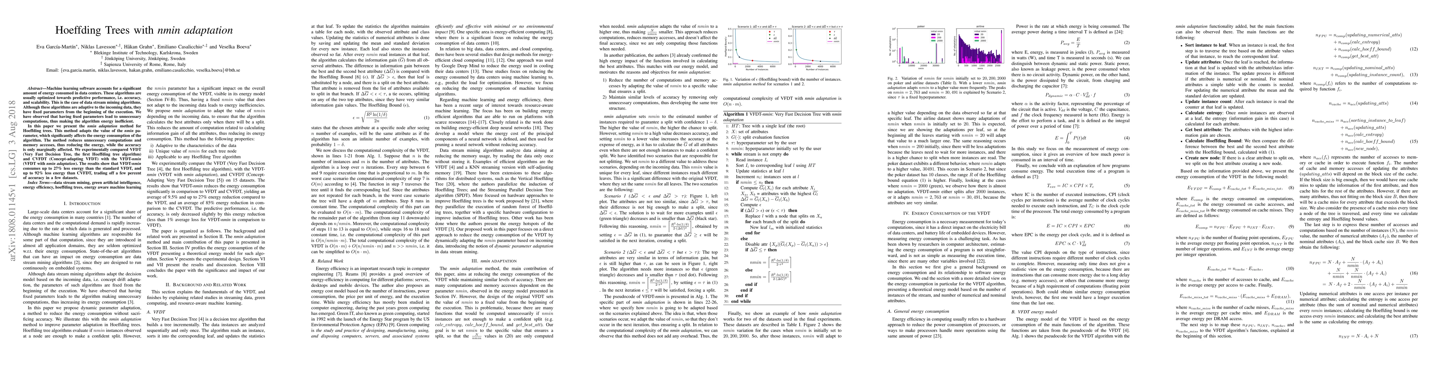 This paper introduces nmin adaptation for Hoeffding trees to reduce energy consumption in machine learning algorithms, achieving up to 92% less energy usage while marginally affecting accuracy.