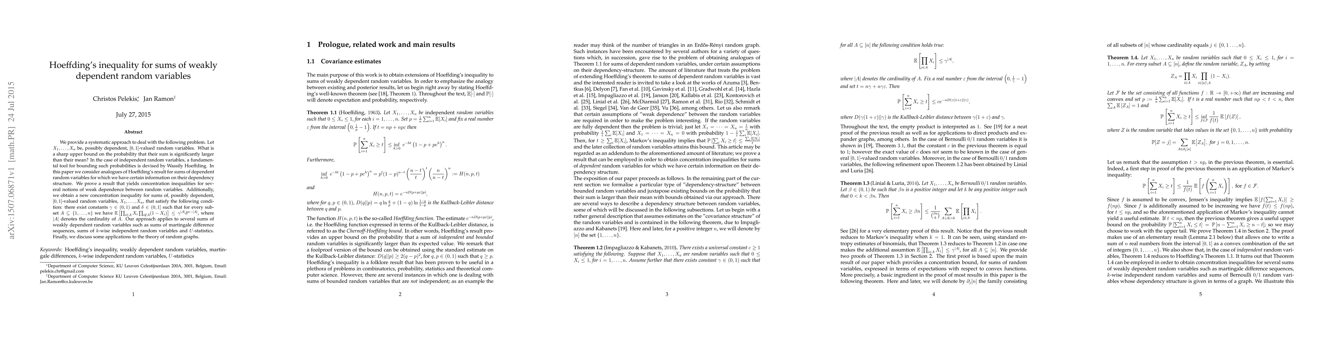 This paper develops concentration inequalities for sums of weakly dependent $[0,1]$-valued random variables, extending Hoeffding's inequality to scenarios where the variables are not necessarily independent. The authors introduce a new bound under a specific dependency condition, applicable to various weakly dependent structures and relevant to random graphs theory.