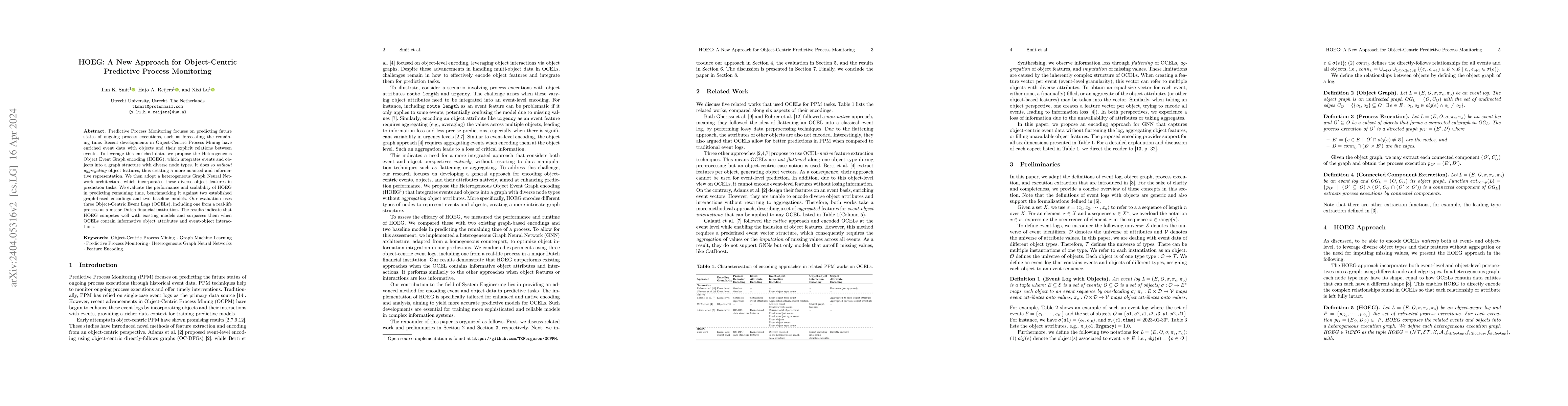 Title: HOEG: A New Approach for Object-Centric Predictive Process Monitoring Summary: HOEG integrates events and objects into a heterogeneous graph structure for nuanced representation, employing a Graph Neural Network to predict remaining time effectively, outperforming established methods when informative object attributes are present.