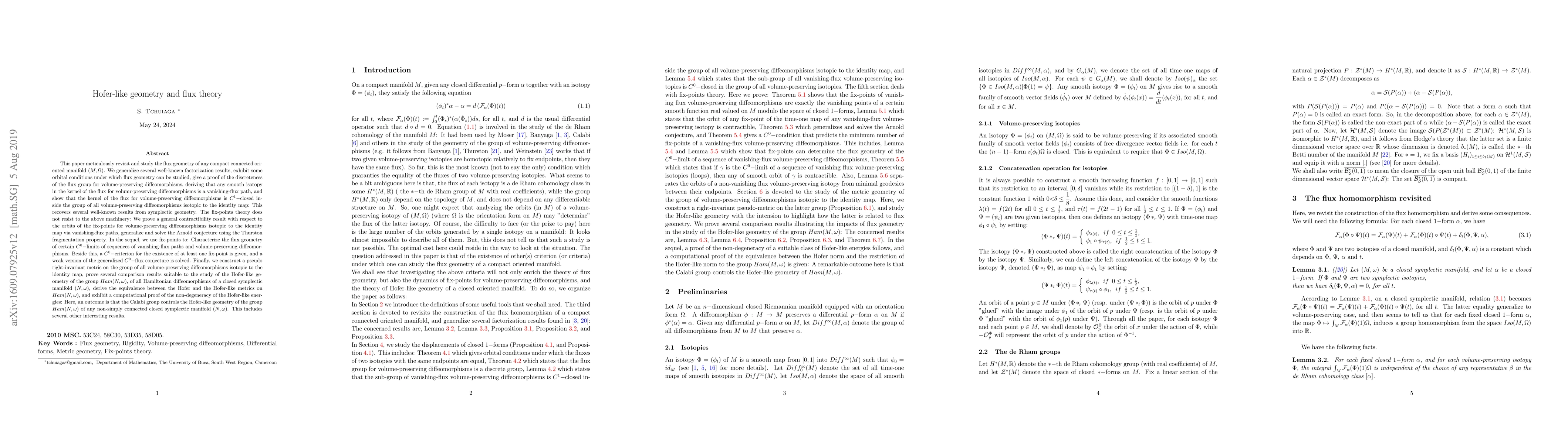 This paper meticulously revisit and study the flux geometry of any compact oriented manifold $(M; W)$. We generalize several well-known factorization results, exhibit some orbital conditions for the study of flux geometry, give a proof of the discreteness of the flux group for volume-preserving diffeomorphisms, show that any smooth path in the kernel of the flux is a vanishing flux path, and show that the kernel of the flux for volume-preserving diffeomorphisms is $C^1$closed inside the group of all volume-preserving diffeomorphisms isotopic to the identity map:This recovers several results from symplectic geometry. The fix-points theory does not resist to the above machinery: We prove a general contractibility result with respect to the orbits of the fix-points for volume-preserving diffeomorphisms isotopic to the identity map via vanishing-flux paths, generalize and solve the Arnold conjecture using the Thurston fragmentation property. In the sequel, we use fix-points to: Characterize the flux geometry of certain $C^0$limits of sequences of vanishing-flux paths and volumepreserving diffeomorphisms. Beside this, a $C^0$criterion for the existence of at least one fix-point is given, and a weak version of the generalized $C^0$flux conjecture is solved. Finally, we construct a pseudo right-invariant metric on the group of all volume-preserving diffeomorphisms isotopic to the identity map, prove several comparison results suitable to the study of the Hofer-like geometry of the group $Ham(N; w)$, of all Hamiltonian diffeomorphisms of a closed symplectic manifold $(N; w)$, derive the equivalence between the Hofer and the Hofer-like metrics on $Ham(N; w)$, and exhibit a computational proof of the non-degeneracy of the Hofer-like energies: Here, an outcome is that the Calabi group controls the Hofer-like geometry of the group $Ham(N; w)$ of any closed symplectic manifold $(N; w)$.