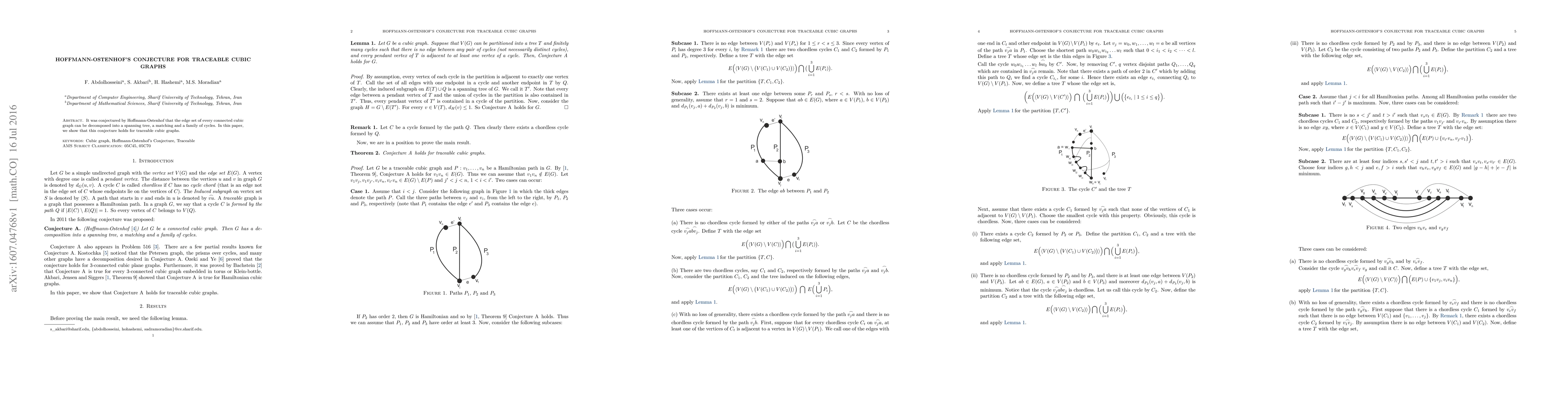 Hoffmann-Ostenhof's conjecture, which posits that the edge set of any connected cubic graph can be decomposed into a spanning tree, a matching, and cycles, is proven true for traceable cubic graphs in this study.