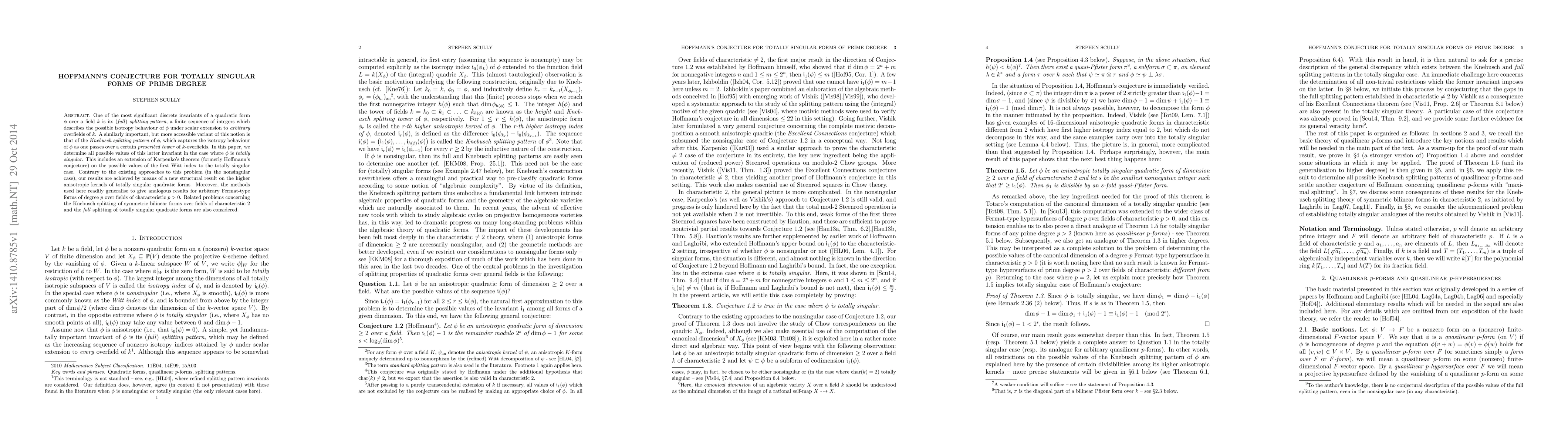One of the most significant discrete invariants of a quadratic form $\phi$ over a field $k$ is its (full) splitting pattern, a finite sequence of integers which describes the possible isotropy behaviour of $\phi$ under scalar extension to arbitrary overfields of $k$. A similarly important, but more accessible variant of this notion is that of the Knebusch splitting pattern of $\phi$, which captures the isotropy behaviour of $\phi$ as one passes over a certain prescribed tower of $k$-overfields. In this paper, we determine all possible values of this latter invariant in the case where $\phi$ is totally singular. This includes an extension of Karpenko's theorem (formerly Hoffmann's conjecture) on the possible values of the first Witt index to the totally singular case. Contrary to the existing approaches to this problem (in the nonsingular case), our results are achieved by means of a new structural result on the higher anisotropic kernels of totally singular quadratic forms. Moreover, the methods used here readily generalise to give analogous results for arbitrary Fermat-type forms of degree $p$ over fields of characteristic $p>0$. Related problems concerning the Knebusch splitting of symmetric bilinear forms over fields of characteristic 2 and the full splitting of totally singular quadratic forms are also considered.