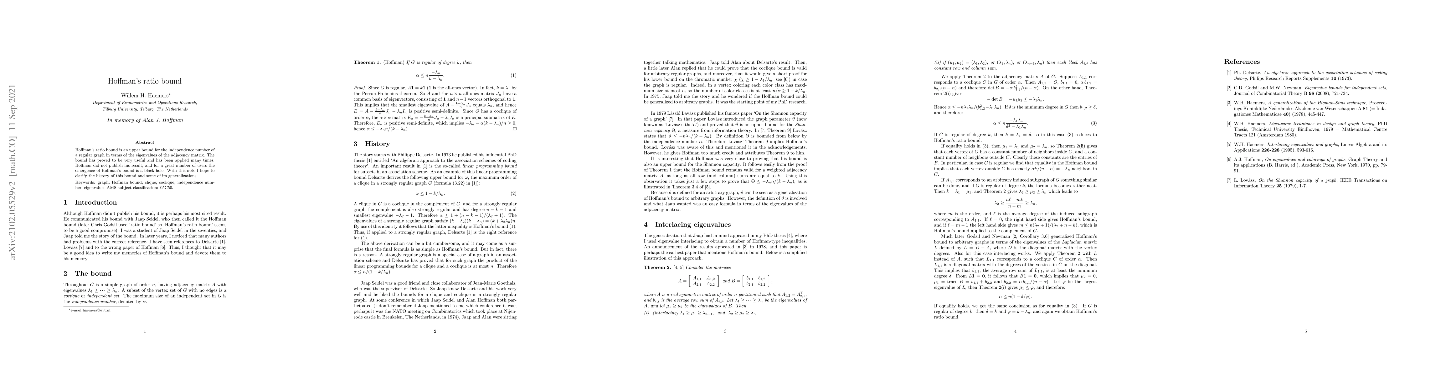 Hoffman's ratio bound is an upper bound for the independence number of a regular graph in terms of the eigenvalues of the adjacency matrix. The bound has proved to be very useful and has been applied many times. Hoffman did not publish his result, and for a great number of users the emergence of Hoffman's bound is a black hole. With this note I hope to clarify the history of this bound and some of its generalizations.