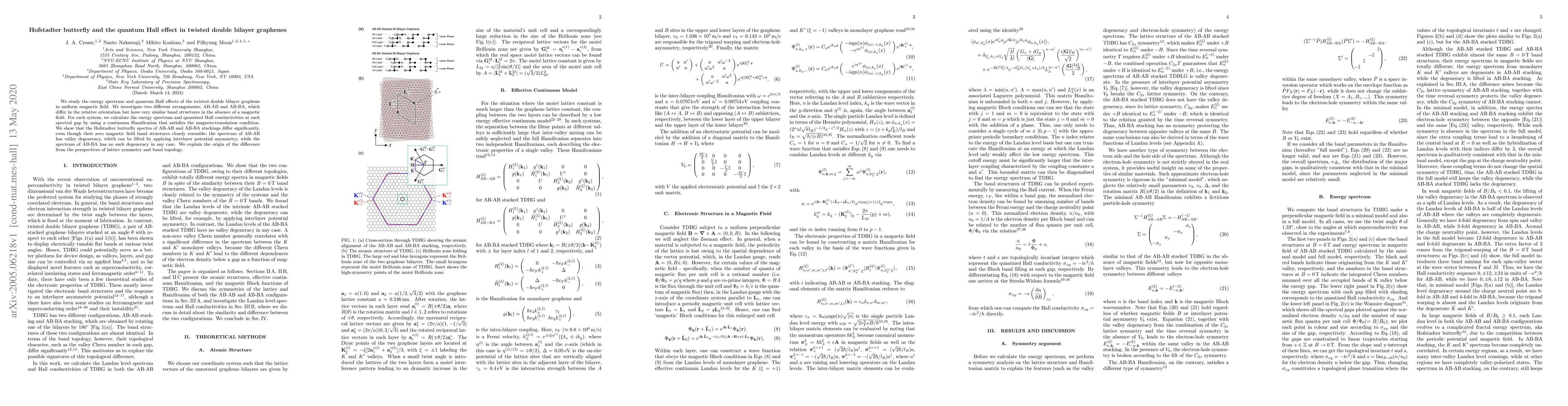 Researchers studied twisted double bilayer graphene in a magnetic field, finding that different stacking arrangements lead to distinct energy spectra and quantum Hall effects due to variations in lattice symmetry and band topology.
