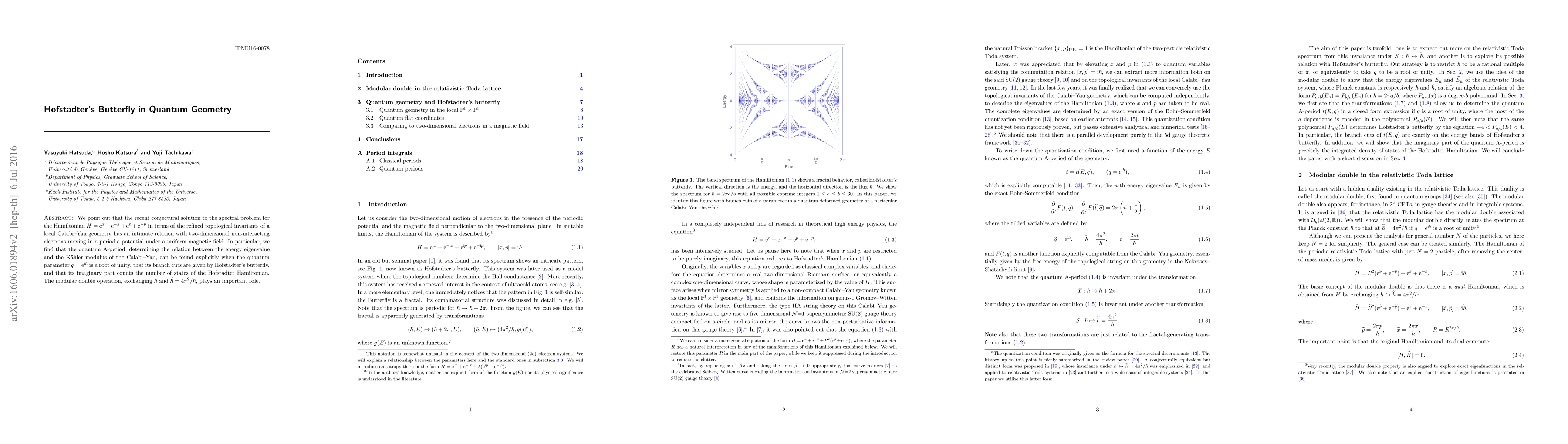 We point out that the recent conjectural solution to the spectral problem for the Hamiltonian $H=e^{x}+e^{-x}+e^{p}+e^{-p}$ in terms of the refined topological invariants of a local Calabi-Yau geometry has an intimate relation with two-dimensional non-interacting electrons moving in a periodic potential under a uniform magnetic field. In particular, we find that the quantum A-period, determining the relation between the energy eigenvalue and the Kahler modulus of the Calabi-Yau, can be found explicitly when the quantum parameter $q=e^{i\hbar}$ is a root of unity, that its branch cuts are given by Hofstadter's butterfly, and that its imaginary part counts the number of states of the Hofstadter Hamiltonian. The modular double operation, exchanging $\hbar$ and $4\pi^2/\hbar$, plays an important role.