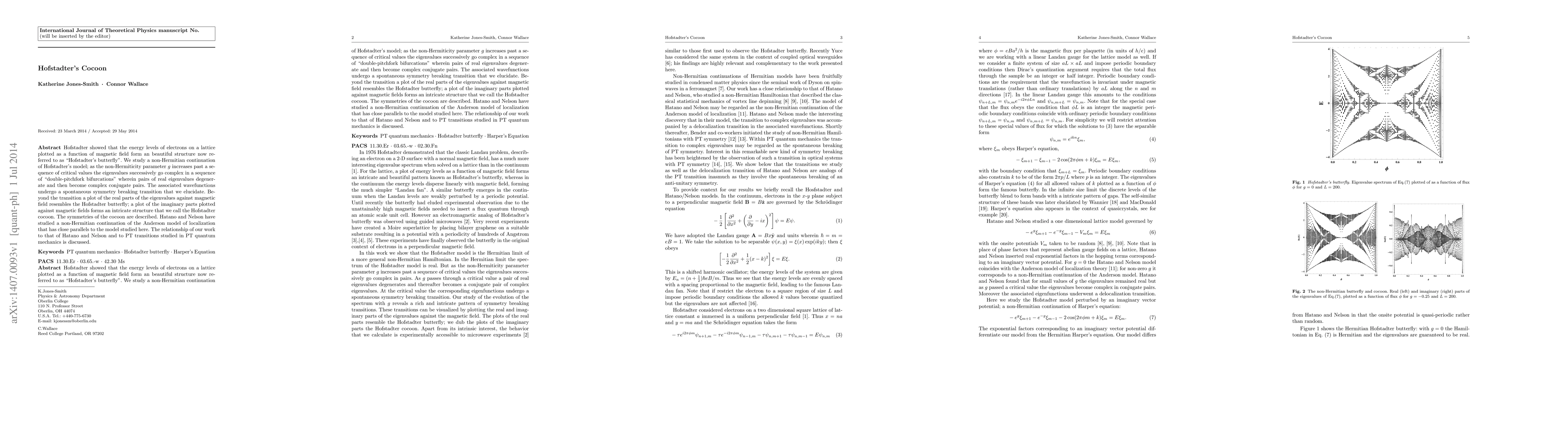 This paper investigates a non-Hermitian extension of Hofstadter's model, revealing complex eigenvalue bifurcations and a spontaneous symmetry breaking transition leading to a structure termed the "Hofstadter cocoon," analogous to the butterfly but with imaginary parts of eigenvalues. The study draws parallels to Hatano and Nelson's work on non-Hermitian localization models.