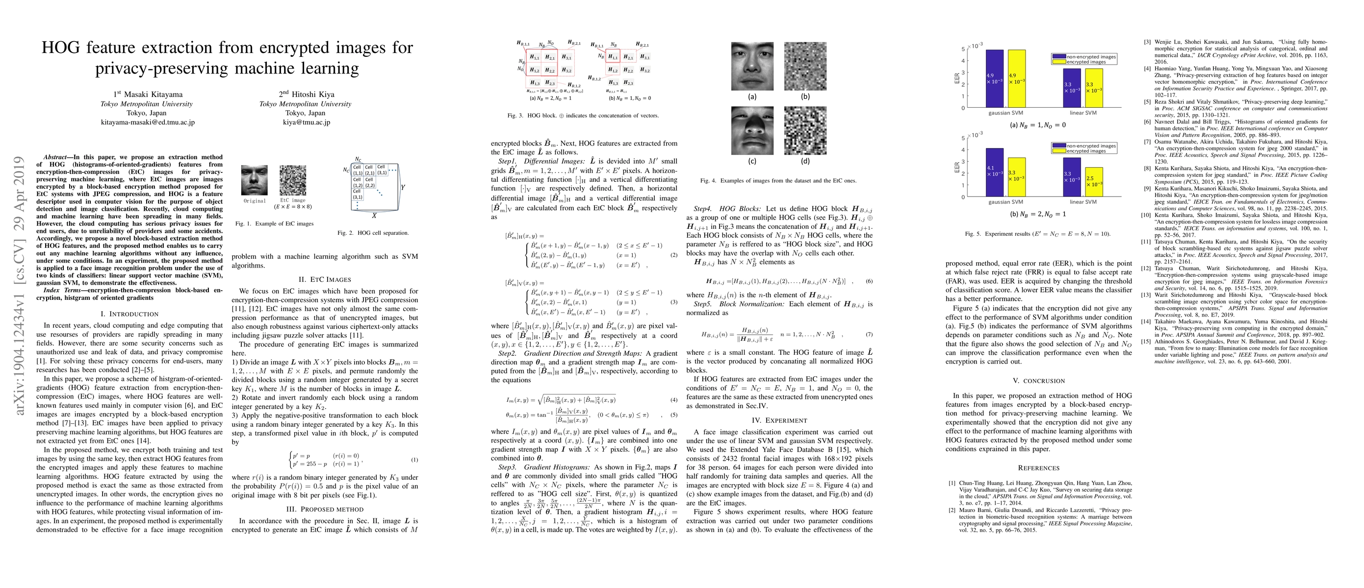 This paper proposes a method for extracting HOG features from encrypted-then-compressed images to enable privacy-preserving machine learning. The method allows for face image recognition using SVM classifiers without compromising privacy, addressing cloud computing's privacy concerns.