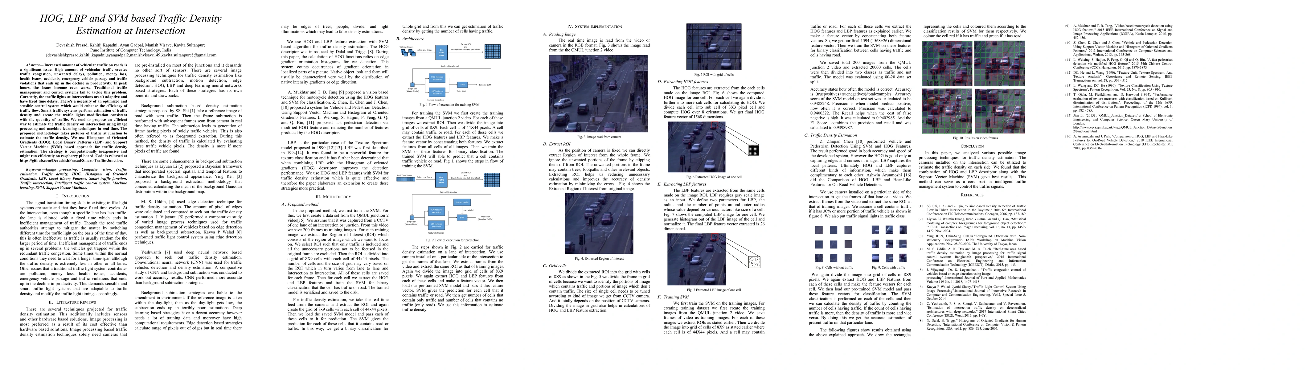 Increased amount of vehicular traffic on roads is a significant issue. High amount of vehicular traffic creates traffic congestion, unwanted delays, pollution, money loss, health issues, accidents, emergency vehicle passage and traffic violations that ends up in the decline in productivity. In peak hours, the issues become even worse. Traditional traffic management and control systems fail to tackle this problem. Currently, the traffic lights at intersections aren't adaptive and have fixed time delays. There's a necessity of an optimized and sensible control system which would enhance the efficiency of traffic flow. Smart traffic systems perform estimation of traffic density and create the traffic lights modification consistent with the quantity of traffic. We tend to propose an efficient way to estimate the traffic density on intersection using image processing and machine learning techniques in real time. The proposed methodology takes pictures of traffic at junction to estimate the traffic density. We use Histogram of Oriented Gradients (HOG), Local Binary Patterns (LBP) and Support Vector Machine (SVM) based approach for traffic density estimation. The strategy is computationally inexpensive and can run efficiently on raspberry pi board. Code is released at https://github.com/DevashishPrasad/Smart-Traffic-Junction.