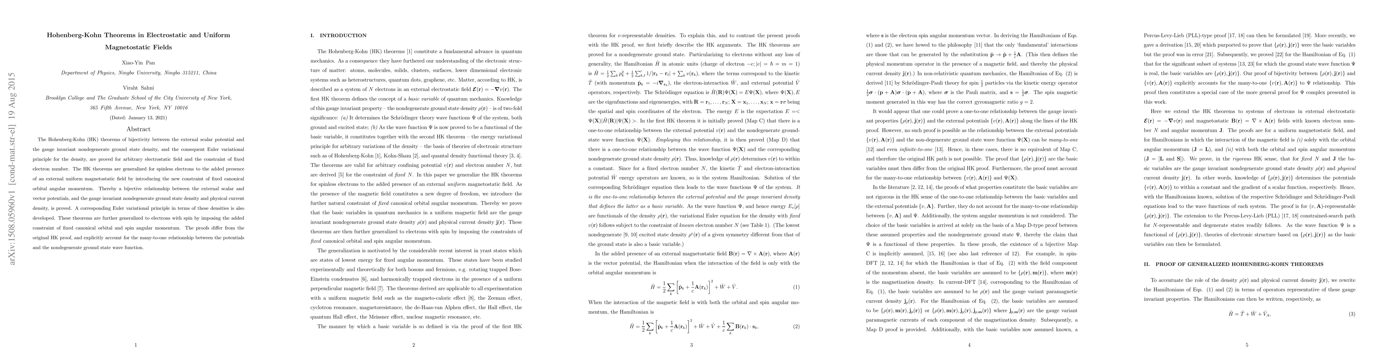The Hohenberg-Kohn (HK) theorems of bijectivity between the external scalar potential and the gauge invariant nondegenerate ground state density, and the consequent Euler variational principle for the density, are proved for arbitrary electrostatic field and the constraint of fixed electron number. The HK theorems are generalized for spinless electrons to the added presence of an external uniform magnetostatic field by introducing the new constraint of fixed canonical orbital angular momentum. Thereby a bijective relationship between the external scalar and vector potentials, and the gauge invariant nondegenerate ground state density and physical current density, is proved. A corresponding Euler variational principle in terms of these densities is also developed. These theorems are further generalized to electrons with spin by imposing the added constraint of fixed canonical orbital and spin angular momentum. The proofs differ from the original HK proof, and explicitly account for the many-to-one relationship between the potentials and the nondegenerate ground state wave function.