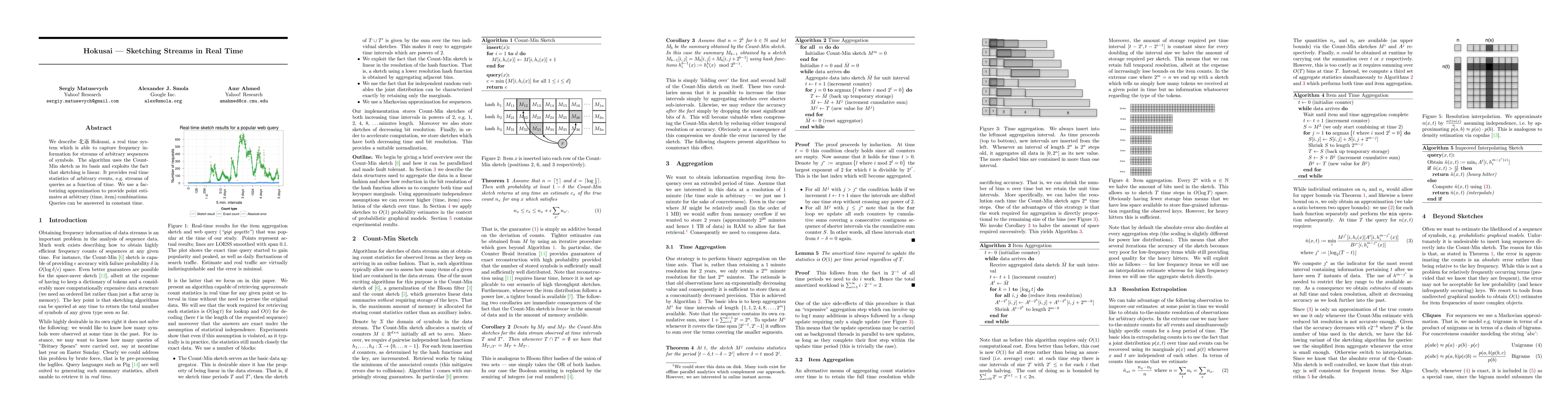 Hokusai is a real-time system that captures frequency information for streams of symbols using the CountMin sketch algorithm, allowing for real-time statistics of events like query streams. It provides constant-time query responses and point estimates through factorizing approximations.