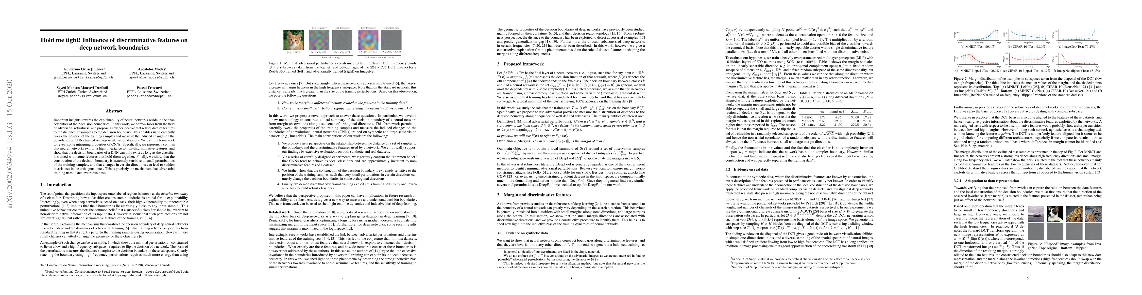 Important insights towards the explainability of neural networks reside in the characteristics of their decision boundaries. In this work, we borrow tools from the field of adversarial robustness, and propose a new perspective that relates dataset features to the distance of samples to the decision boundary. This enables us to carefully tweak the position of the training samples and measure the induced changes on the boundaries of CNNs trained on large-scale vision datasets. We use this framework to reveal some intriguing properties of CNNs. Specifically, we rigorously confirm that neural networks exhibit a high invariance to non-discriminative features, and show that the decision boundaries of a DNN can only exist as long as the classifier is trained with some features that hold them together. Finally, we show that the construction of the decision boundary is extremely sensitive to small perturbations of the training samples, and that changes in certain directions can lead to sudden invariances in the orthogonal ones. This is precisely the mechanism that adversarial training uses to achieve robustness.
