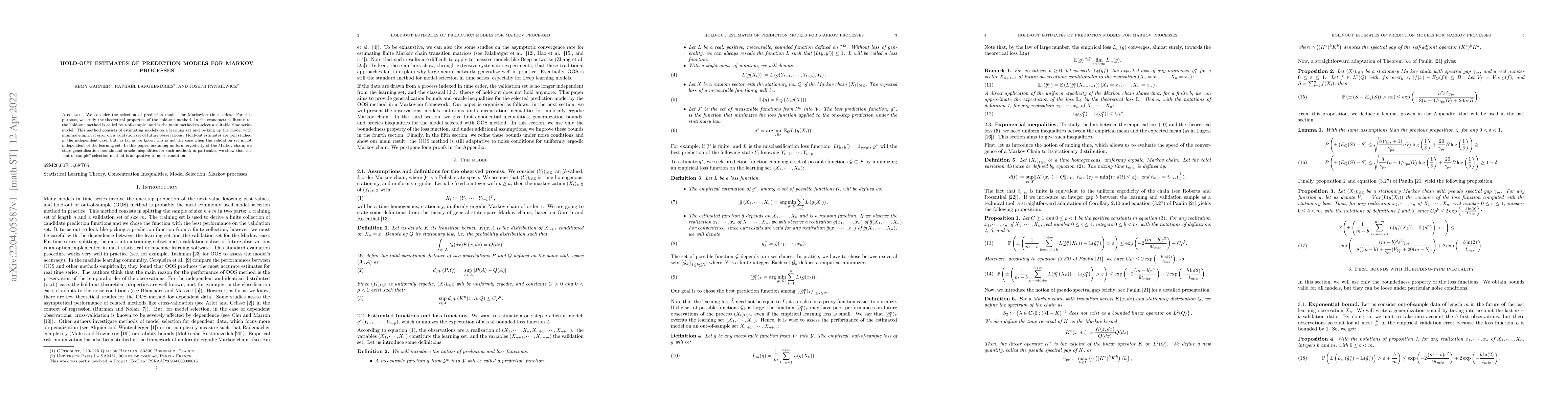 We consider the selection of prediction models for Markovian time series. For this purpose, we study the theoretical properties of the hold-out method. In the econometrics literature, the hold-out method is called out-of-sample and is the main method to select a suitable time series model. This method consists of estimating models on a learning set and picking up the model with minimal empirical error on a validation set of future observations. Hold-out estimates are well studied in the independent case, but, as far as we know, this is not the case when the validation set is not independent of the learning set. In this paper, assuming uniform ergodicity of the Markov chain, we state generalization bounds and oracle inequalities for such method; in particular, we show that the out-of-sample selection method is adaptative to noise condition.