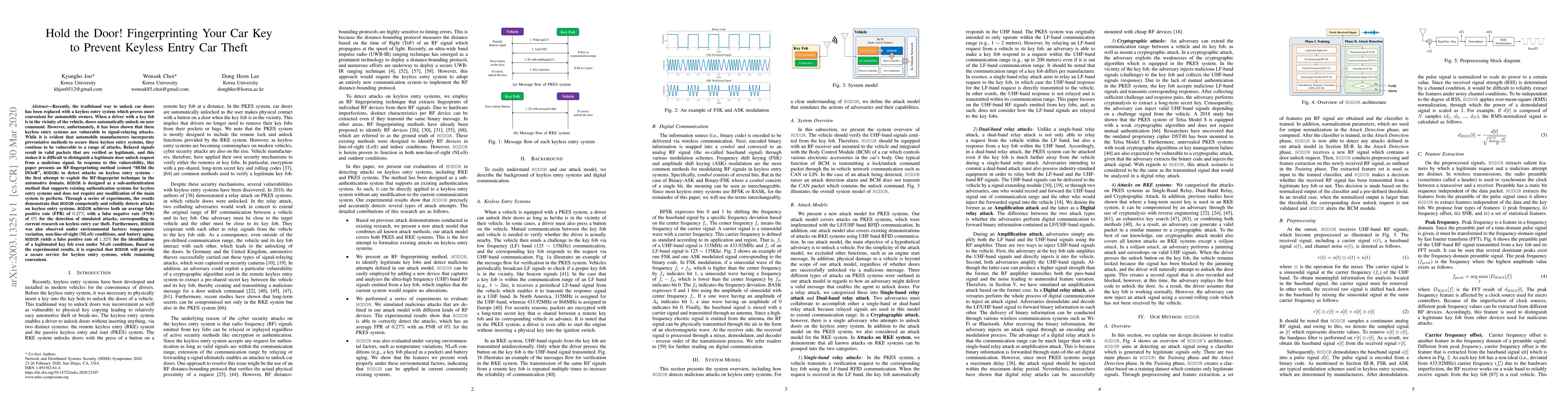 This paper proposes HODOR, an RF fingerprinting method to detect and prevent attacks on keyless entry car systems, which are vulnerable to signal relaying. HODOR functions as a supplementary authentication method without requiring changes to the existing system, achieving a 0.27% false positive rate and a 0% false negative rate in experiments.
