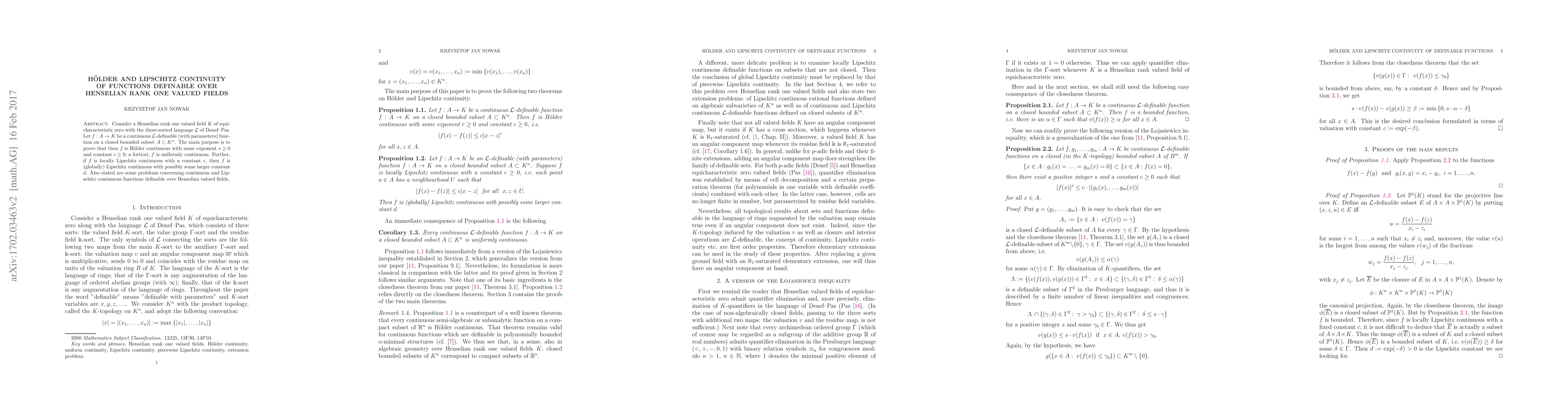 Consider a Henselian rank one valued field $K$ of equicharacteristic zero with the three-sorted language $\mathcal{L}$ of Denef--Pas. Let $f: A \to K$ be a continuous $\mathcal{L}$-definable (with parameters) function on a closed bounded subset $A \subset K^{n}$. The main purpose is to prove that then $f$ is H\"older continuous with some exponent $s\geq 0$ and constant $c \geq 0$, a fortiori, $f$ is uniformly continuous. Further, if $f$ is locally Lipschitz continuous with a constant $c$, then $f$ is (globally) Lipschitz continuous with possibly some larger constant $d$. Also stated are some problems concerning continuous and Lipschitz continuous functions definable over Henselian valued fields.