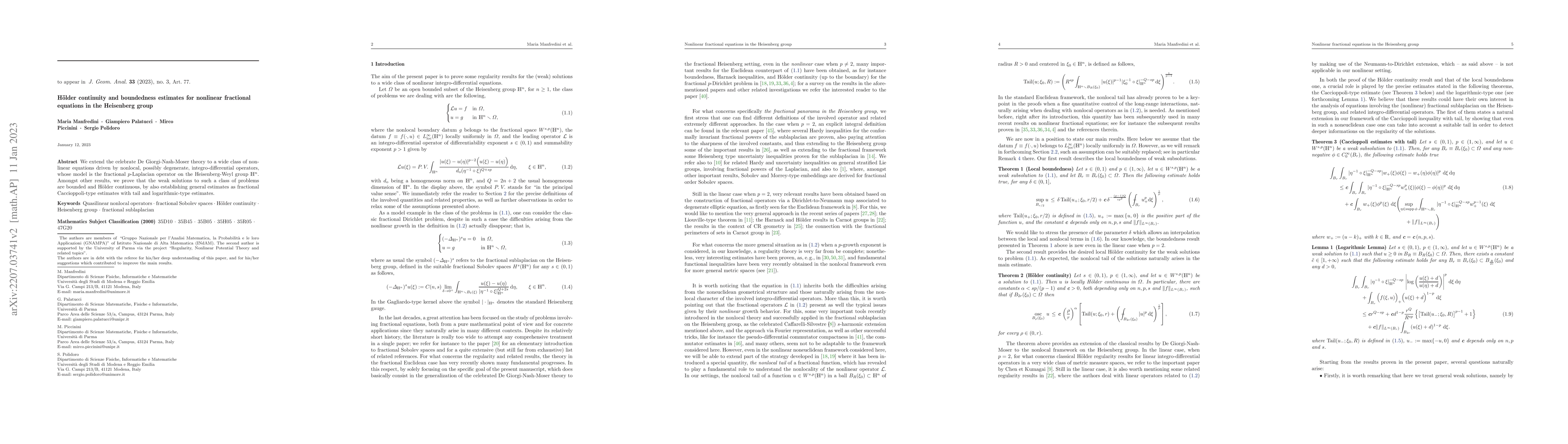 This paper extends the De Giorgi-Nash-Moser theory to nonlinear fractional equations in the Heisenberg group, proving that weak solutions are bounded and H\"older continuous, with established fractional Caccioppoli-type and logarithmic-type estimates.
