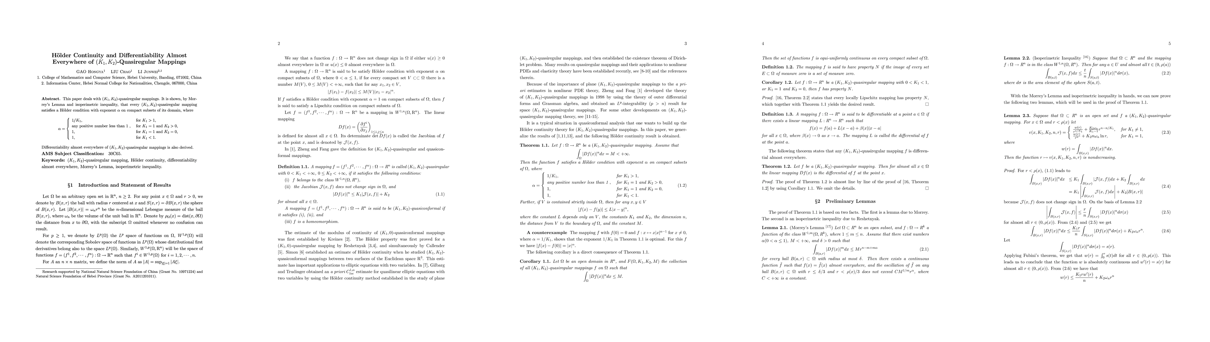 This paper deals with $(K_1, K_2)$-quasiregular mappings. It is shown, by Morrey's Lemma and isoperimetric inequality, that every $(K_1, K_2)$-quasiregular mapping satisfies a H\"older condition with exponent $\alpha$ on compact subsets of its domain, where \begin{align} \alpha=\begin{cases} 1/K_1, & \text{for } K_1>1, \\ \text{any positive number less than } 1, & \text{for } K_1=1 \text{ and } K_2>0, \\ 1, & \text{for } K_1=1 \text{ and } K_2=0, \\ 1, & \text{for } K_1<1,\\ \end{cases} \end{align} Differentiability almost everywhere of $(K_1, K_2)$-quasiregular mappings is also derived.