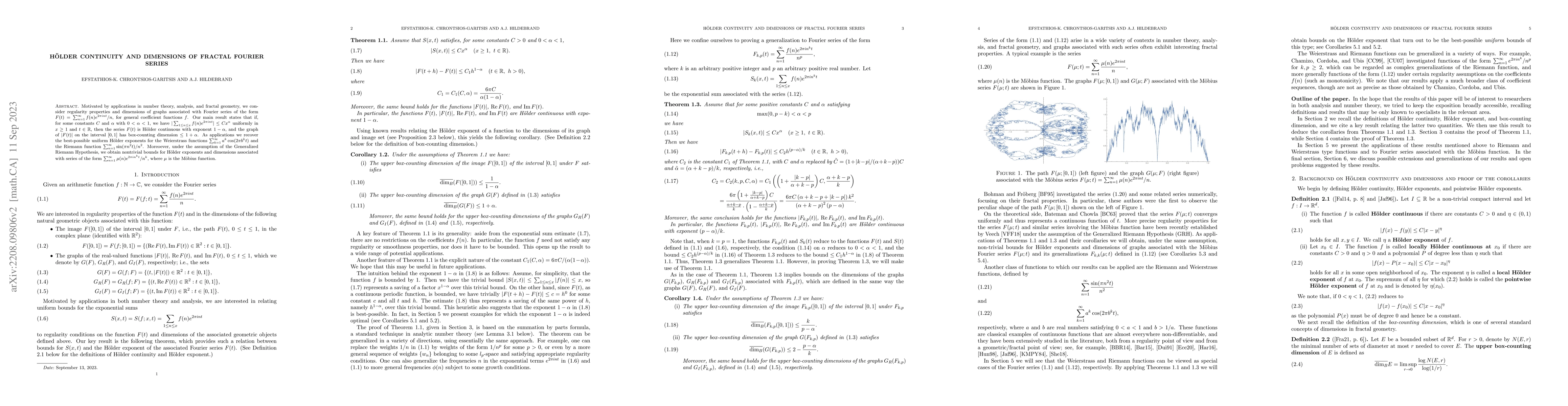 Motivated by applications in number theory, analysis, and fractal geometry, we consider regularity properties and dimensions of graphs associated with Fourier series of the form $F(t)=\sum_{n=1}^\infty f(n)e^{2\pi i nt}/n$, for a large class of coefficient functions $f$. Our main result states that if, for some constants $C$ and $\alpha$ with $0<\alpha<1$, we have $|\sum_{1\le n\le x}f(n)e^{2\pi i nt}|\le C x^{\alpha}$ uniformly in $x\ge 1$ and $t\in \mathbb{R}$, then the series $F(t)$ is H\"older continuous with exponent $1-\alpha$, and the graph of $|F(t)|$ on the interval $[0,1]$ has box-counting dimension $\leq 1+\alpha$. As applications we recover the best-possible uniform H\"older exponents for the Weierstrass functions $\sum_{k=1}^\infty a^k\cos(2\pi b^k t)$ and the Riemann function $\sum_{n=1}^\infty \sin(\pi n^2 t)/n^2$. Moreoever, under the assumption of the Generalized Riemann Hypothesis, we obtain nontrivial bounds for H\"older exponents and dimensions associated with series of the form $\sum_{n=1}^\infty \mu(n)e^{2\pi i n^kt}/n^k$, where $\mu$ is the M\"obius function.