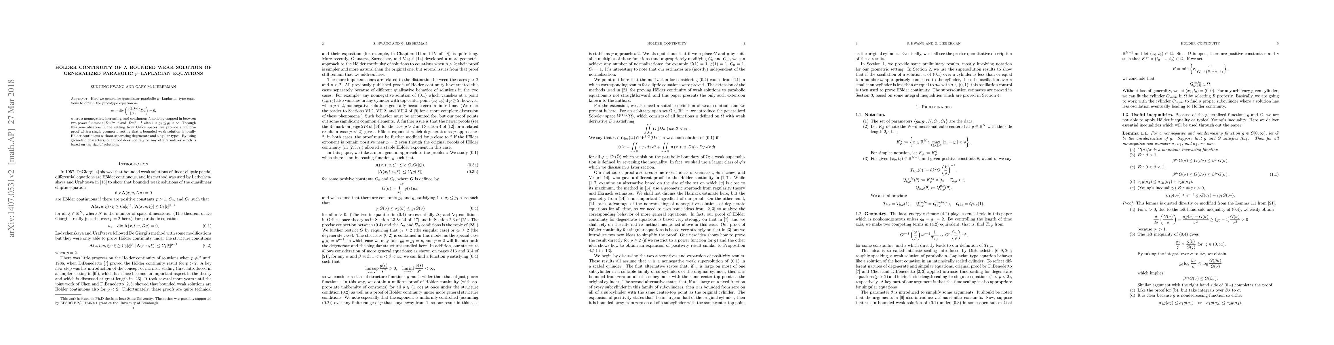 The paper generalizes quasilinear parabolic p-Laplacian type equations, providing a uniform proof for Hölder continuity of bounded weak solutions in Orlicz spaces, considering cases for 1 < g0 ≤ g1 ≤ 2 and 2 ≤ g0 ≤ g1 < ∞ separately.