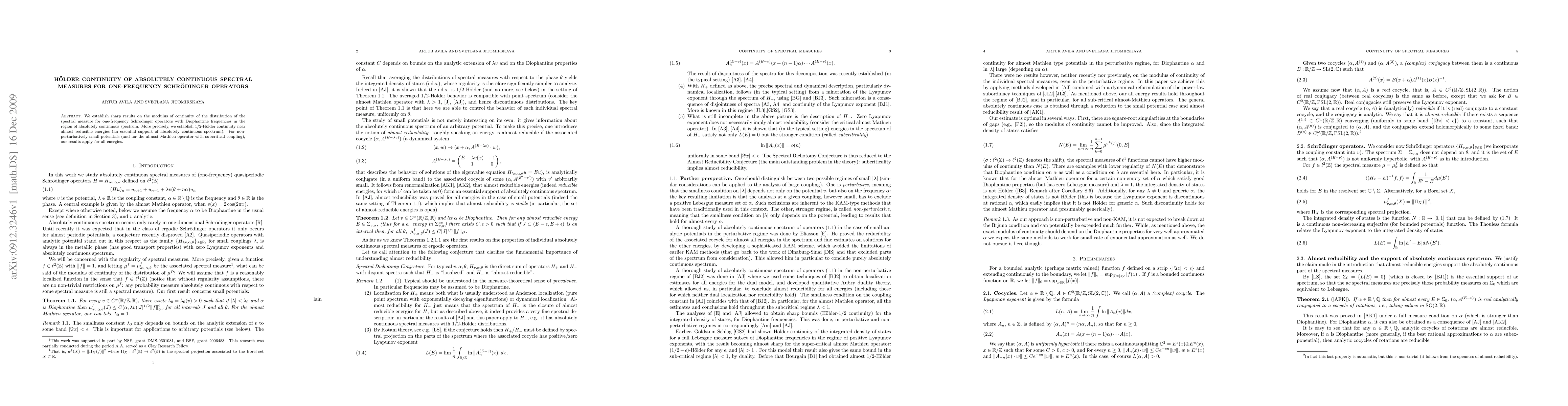 Summary: This paper proves 1/2-Holder continuity of the spectral measure distribution for one-frequency Schrödinger operators with Diophantine frequencies, focusing on the region of absolutely continuous spectrum near almost reducible energies. The results apply to all energies for non-perturbatively small potentials and the almost Mathieu operator with subcritical coupling.