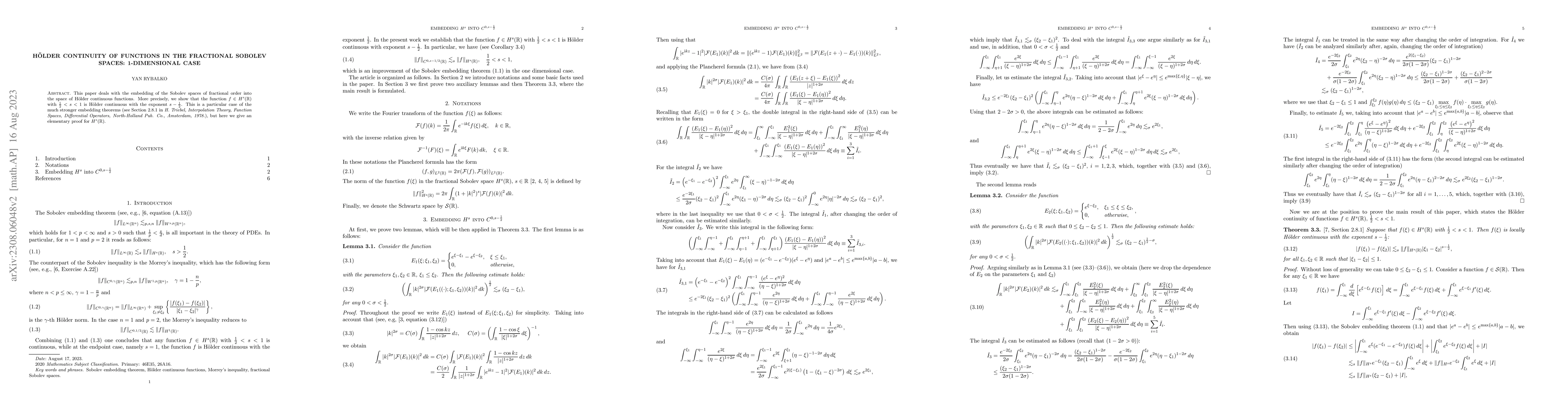 This paper proves that functions in the 1-dimensional fractional Sobolev space $H^s(\mathbb{R})$ with $\frac{1}{2}<s<1$ are H\"older continuous with an exponent of $s-\frac{1}{2}$, providing an elementary proof for this embedding.