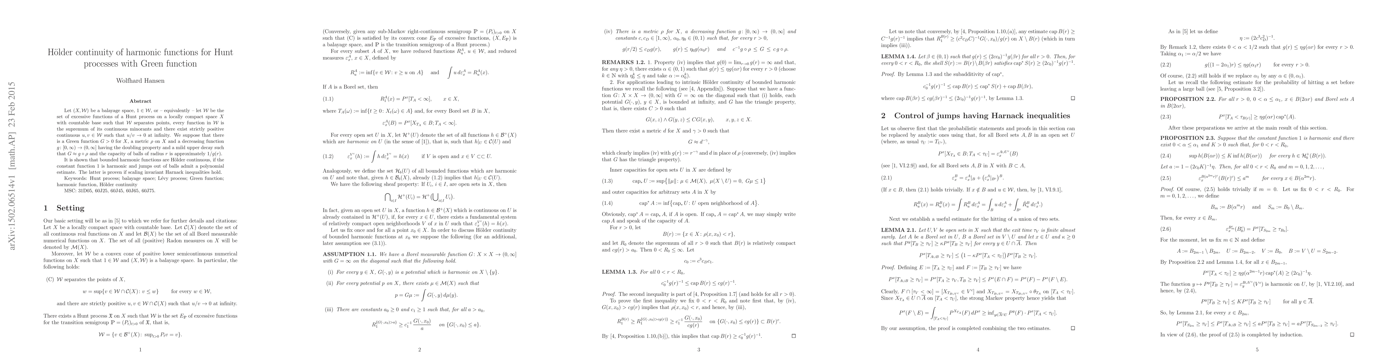Let $(X,\mathcal W)$ be a balayage space, $1\in \mathcal W$, or - equivalently - let $\mathcal W$ be the set of excessive functions of a Hunt process on a locally compact space $X$ with countable base such that $\mathcal W$ separates points, every function in $\mathcal W$ is the supremum of its continuous minorants and there exist strictly positive continuous $u,v\in \mathcal W$ such that $u/v\to 0$ at infinity. We suppose that there is a Green function $G>0$ for $X$, a metric $\rho$ on $X$ and a decreasing function $g\colon[0,\infty)\to (0,\infty]$ having the doubling property and a mild upper decay such that $G\approx g\circ\rho$ and the capacity of balls of radius $r$ is approximately $1/g(r)$. It is shown that bounded harmonic functions are H\"older continuous, if the constant function $1$ is harmonic and jumps out of balls admit a polynomial estimate. The latter is proven if scaling invariant Harnack inequalities hold.