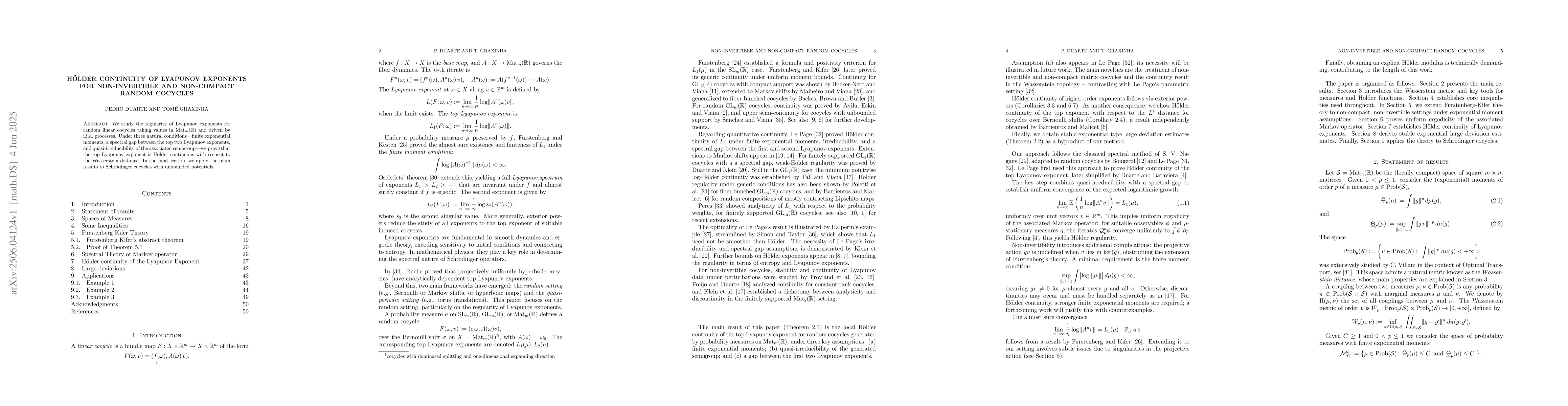 The research employs the study of regularity of Lyapunov exponents for random linear cocycles driven by i.i.d. processes, under specific conditions including finite exponential moments, a spectral gap, and quasi-irreducibility.