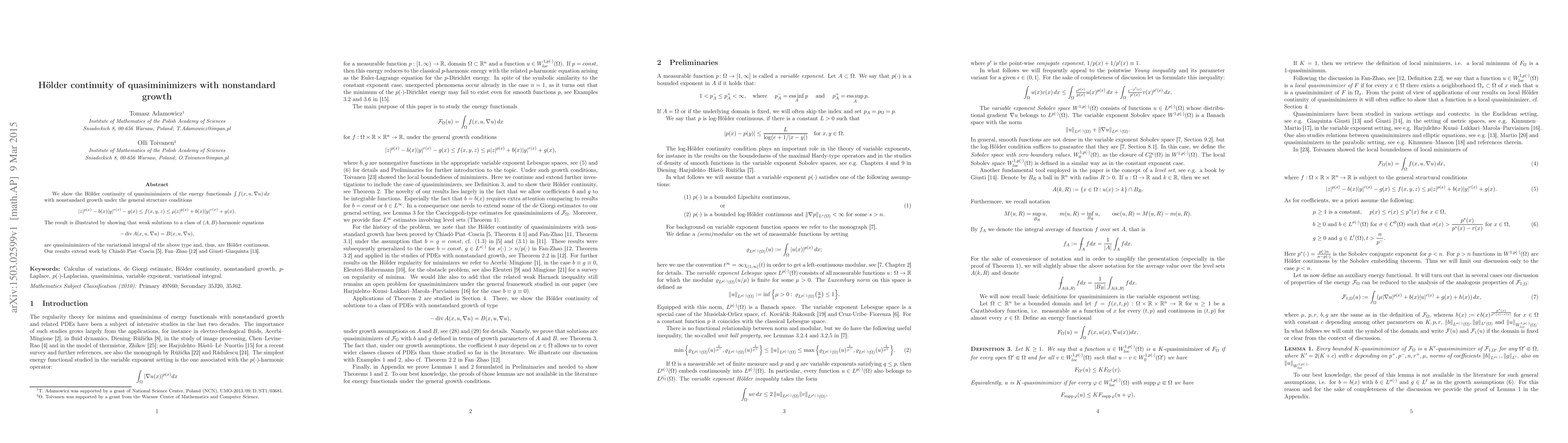 We show the H\"older continuity of quasiminimizers of the energy functionals $\int f(x,u,\nabla u)\,dx$ with nonstandard growth under the general structure conditions $$ |z|^{p(x)} - b(x)|y|^{r(x)}-g(x) \leq f(x,y,z) \leq \mu|z|^{p(x)} + b(x)|y|^{r(x)} + g(x). $$ The result is illustrated by showing that weak solutions to a class of $(A,B)$-harmonic equations $$ -{\rm div} A(x,u,\nabla u) = B(x,u,\nabla u), $$ are quasiminimizers of the variational integral of the above type and, thus, are H\"older continuous. Our results extend works by Chiad\`o Piat-Coscia, Fan-Zhao and Giusti-Giaquinta.