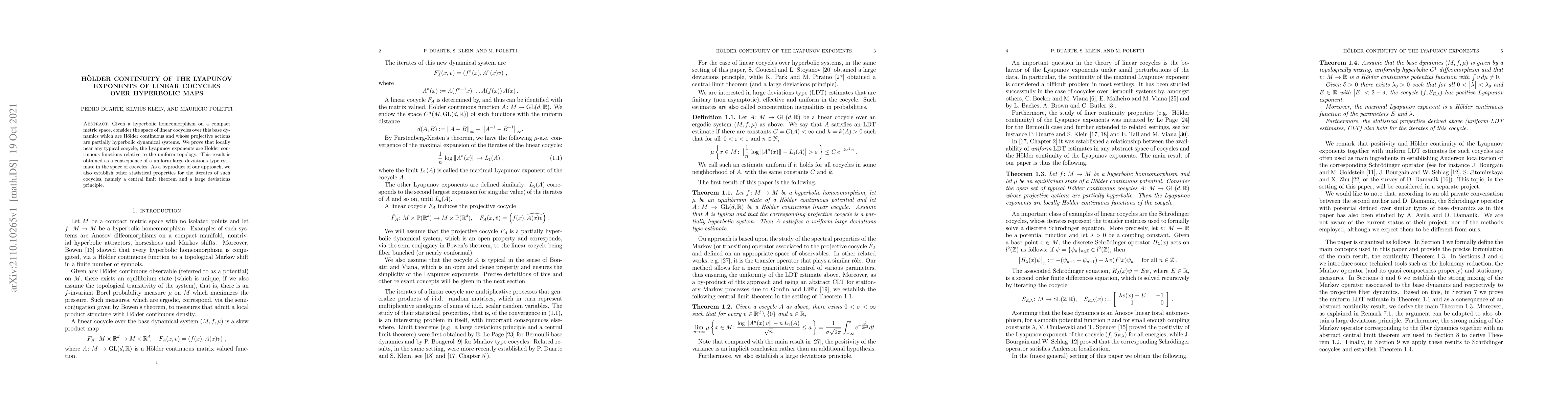 This paper proves that Lyapunov exponents for H\"older continuous linear cocycles over hyperbolic maps are locally H\"older continuous. The result arises from a uniform large deviations estimate and also yields a central limit theorem and a large deviations principle for cocycle iterates.