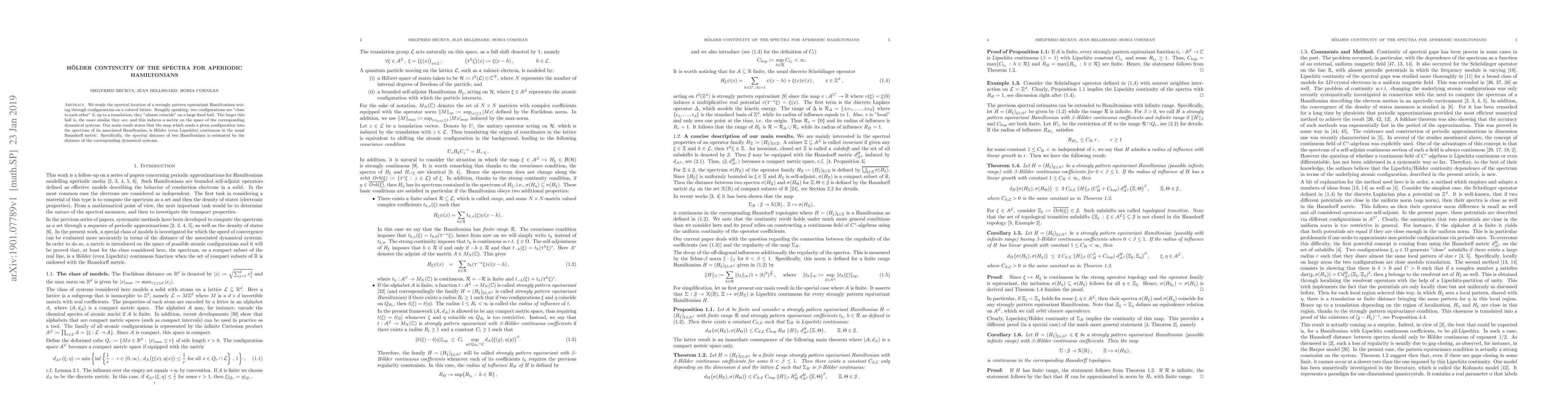 We study the spectral location of strongly pattern equivariant Hamiltonians arising through configurations on a colored lattice. Roughly speaking, two configurations are "close to each other" if, up to a translation, they "almost coincide" on a large fixed ball. The larger this ball is, the more similar they are, and this induces a metric on the space of the corresponding dynamical systems. Our main result states that the map which sends a given configuration into the spectrum of its associated Hamiltonian, is H\"older (even Lipschitz) continuous in the usual Hausdorff metric. Specifically, the spectral distance of two Hamiltonians is estimated by the distance of the corresponding dynamical systems.