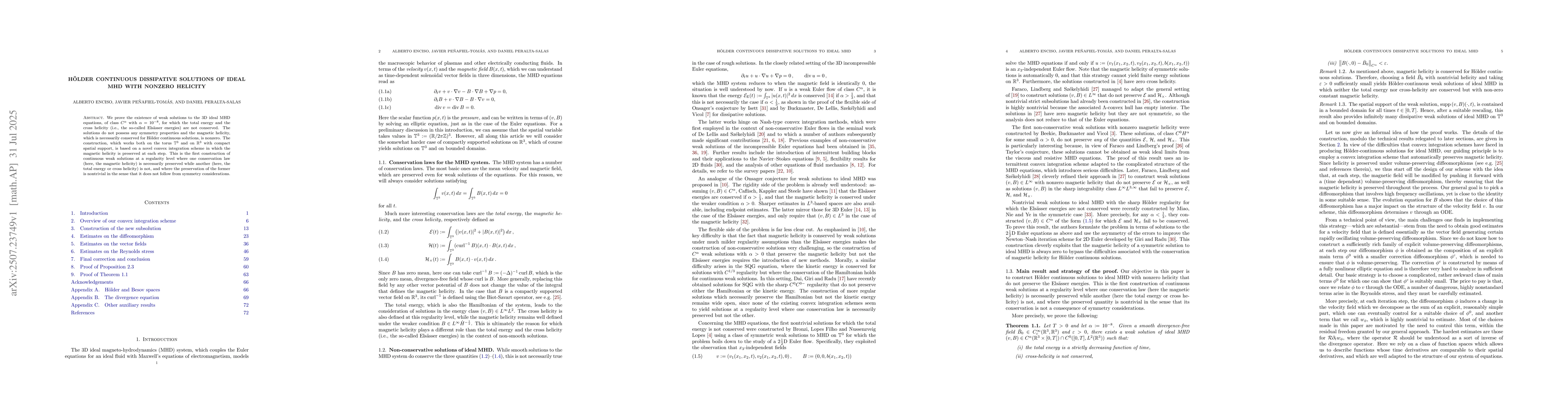 We prove the existence of weak solutions to the 3D ideal MHD equations, of class $C^\alpha$ with $\alpha=10^{-8}$, for which the total energy and the cross helicity (i.e., the so-called Els\"asser energies) are not conserved. The solutions do not possess any symmetry properties and the magnetic helicity, which is necessarily conserved for H\"older continuous solutions, is nonzero. The construction, which works both on the torus $\mathbb{T}^3$ and on $\mathbb{R}^3$ with compact spatial support, is based on a novel convex integration scheme in which the magnetic helicity is preserved at each step. This is the first construction of continuous weak solutions at a regularity level where one conservation law (here, the magnetic helicity) is necessarily preserved while another (here, the total energy or cross helicity) is not, and where the preservation of the former is nontrivial in the sense that it does not follow from symmetry considerations.