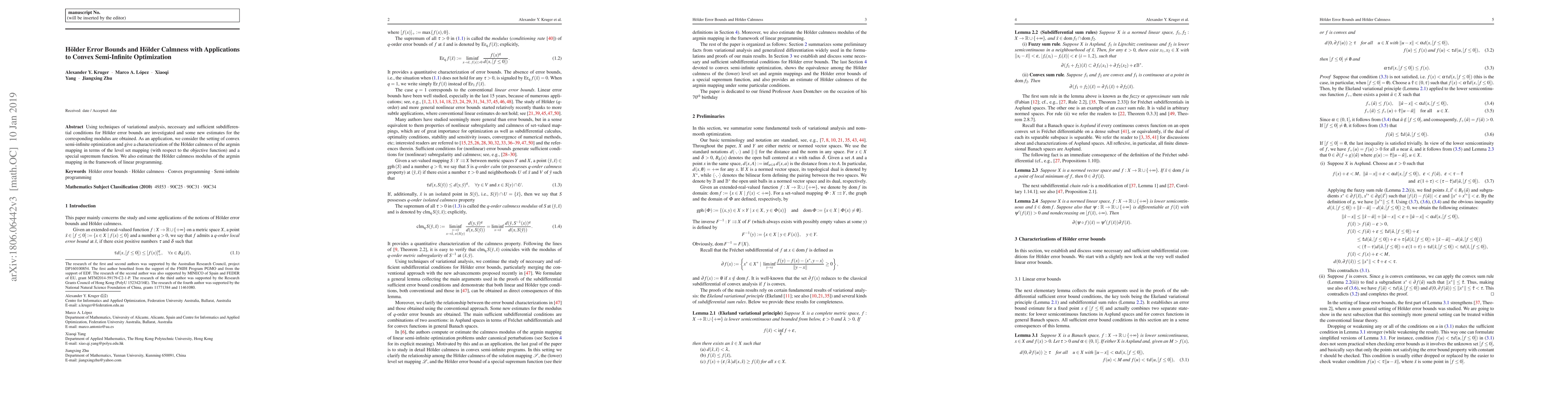 This paper investigates necessary and sufficient conditions for H\"older error bounds using variational analysis, and provides new estimates for the corresponding modulus. It applies these findings to convex semi-infinite optimization, characterizing the H\"older calmness of the argmin mapping and estimating its calmness modulus in linear programming.