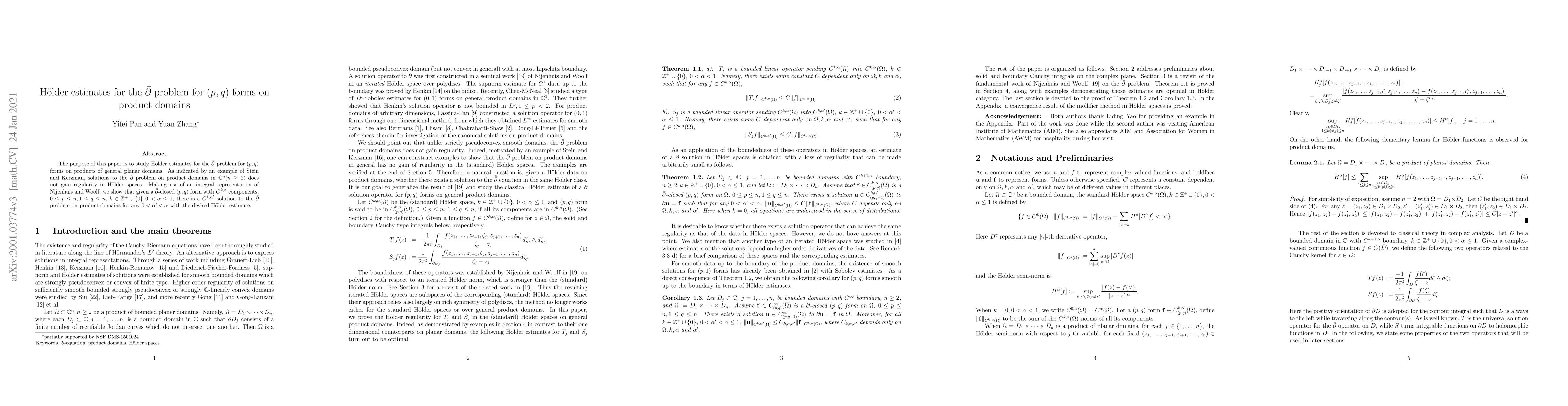 This paper investigates H\"older estimates for the $\bar\partial$ problem for $(p,q)$ forms on product domains of general planar domains, demonstrating that solutions retain regularity in H\"older spaces despite the lack of such regularity in Stein and Kerzman's example. Using an integral representation by Nijenhuis and Woolf, it proves the existence of a $C^{k, \alpha'}$ solution for any $0<\alpha'<\alpha$.